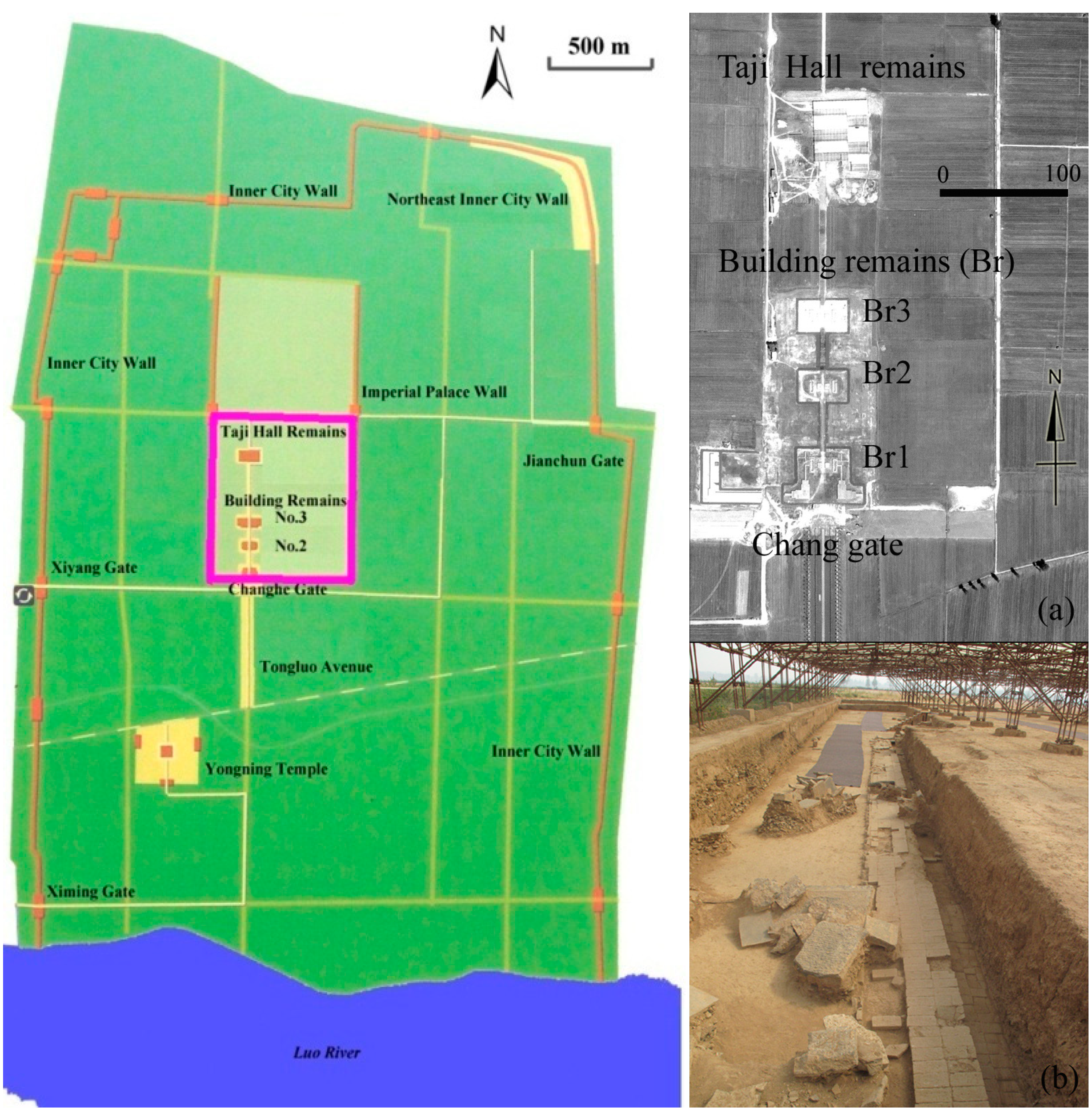 Layout of Easten Han to Northern-Wei Dynasty Luoyang Capital City located (from [38]). In Figure 4 green box denotes its location. (a) detail of the imperial palace area highlighted by the pink rectangle from panchromatic satellite Pleiades image (b) photo of the excavation in Taiji Hall.