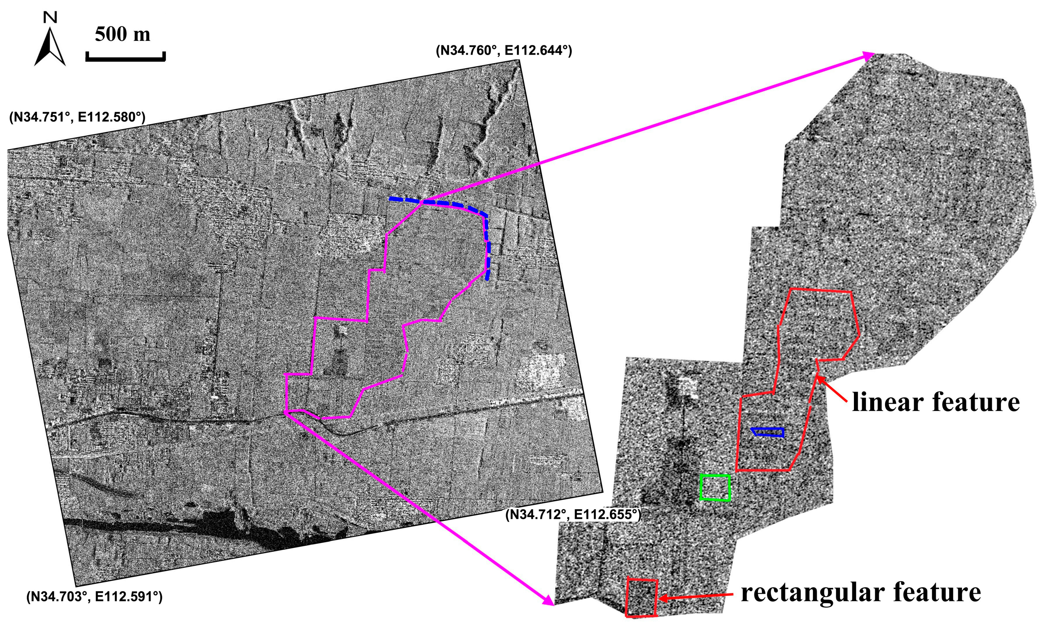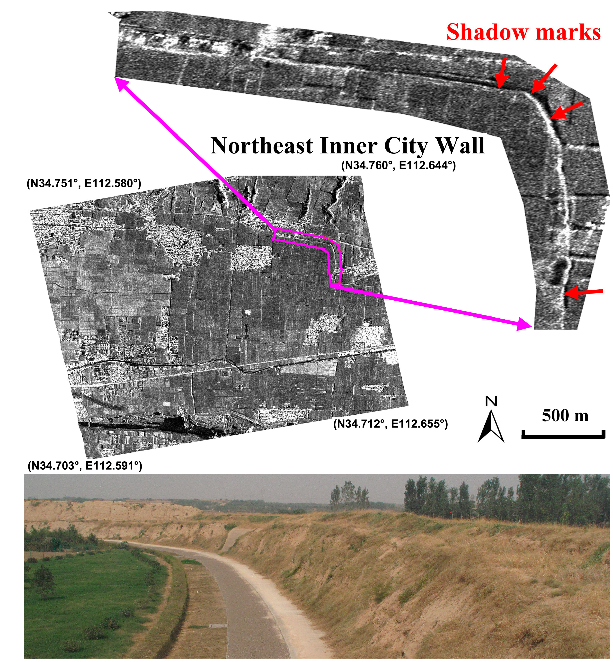 Shadow marks of the Northeast Inner City Wall on the Eastern-Han to Northern-Wei Dynasty Luoyang city site (highlighted by the green polygon in Figure 4) using a stacking-averaged SAR image. The ancient wall is highlighted by the purple polygon with its details illustrated in the upper subset. Shadow marks are shown by red arrows. Lower image shows a detail of the City wall.