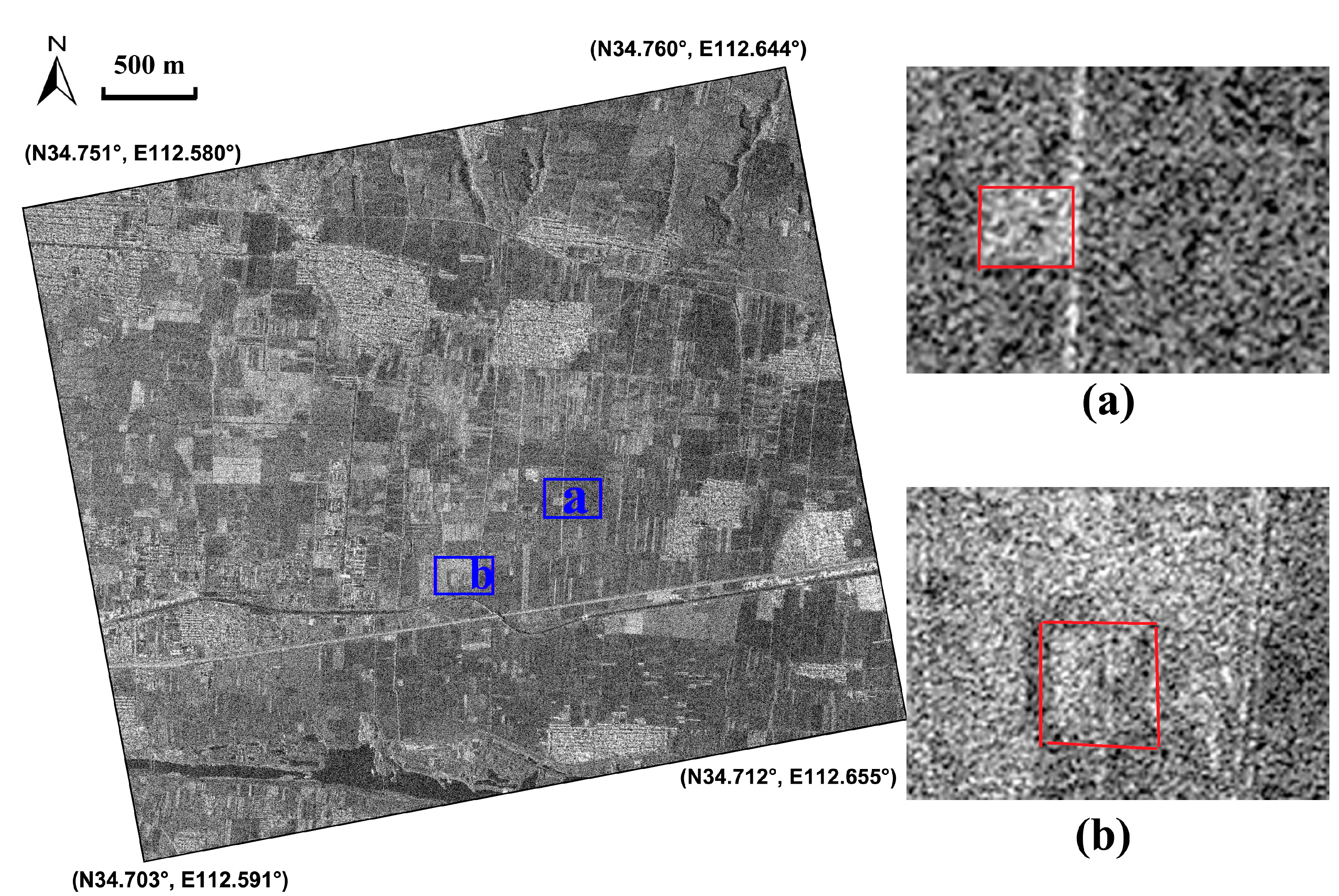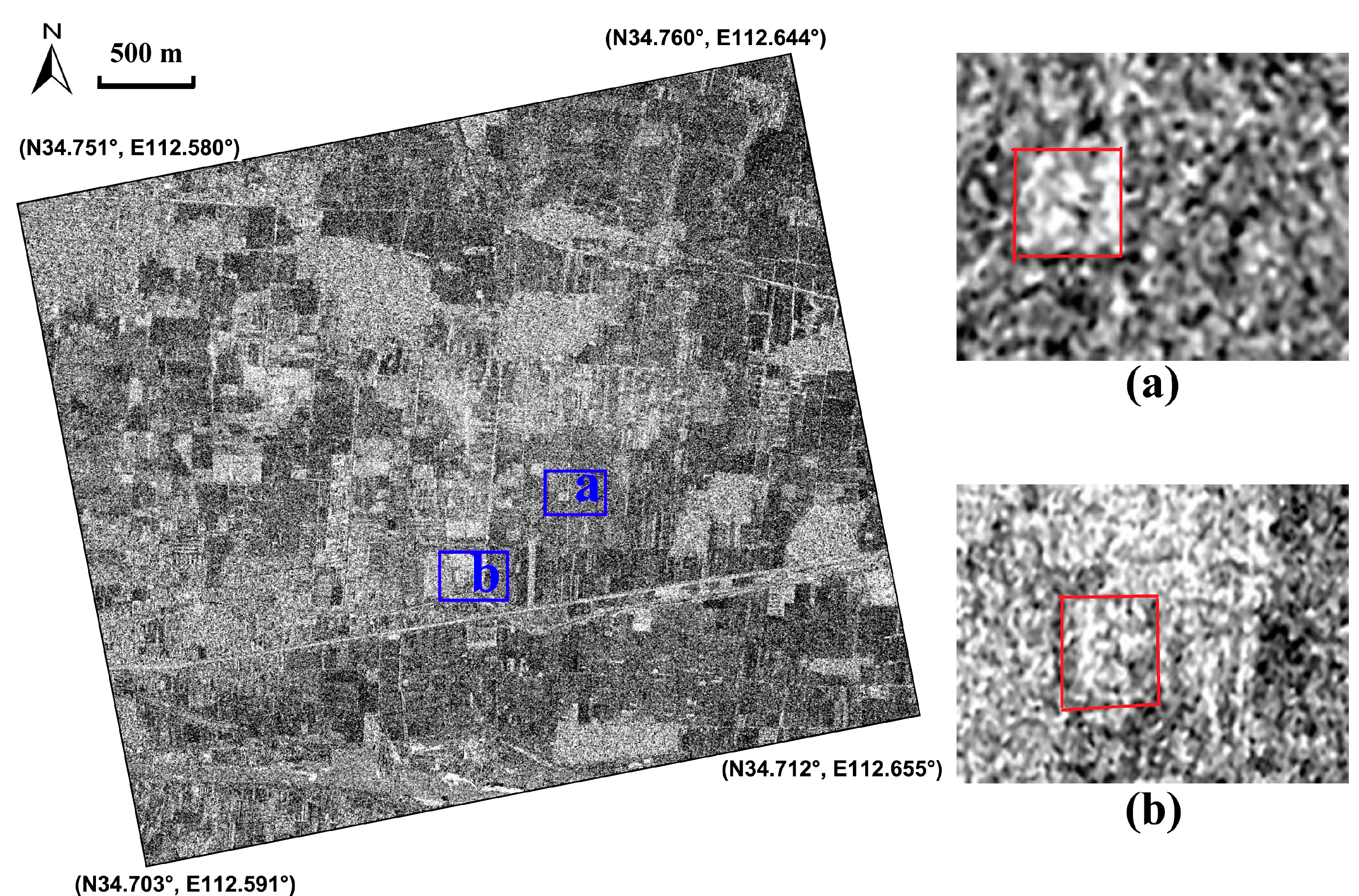 Crop marks relating to the Eastern-Han to Northern-Wei Dynasty Luoyang city site (highlighted by the green polygon in Figure 4) on the SAR image of 19 March 2013 performed by the Gaussian filter. Positive and negative crop marks have been detected, marked by (a) and (b).
