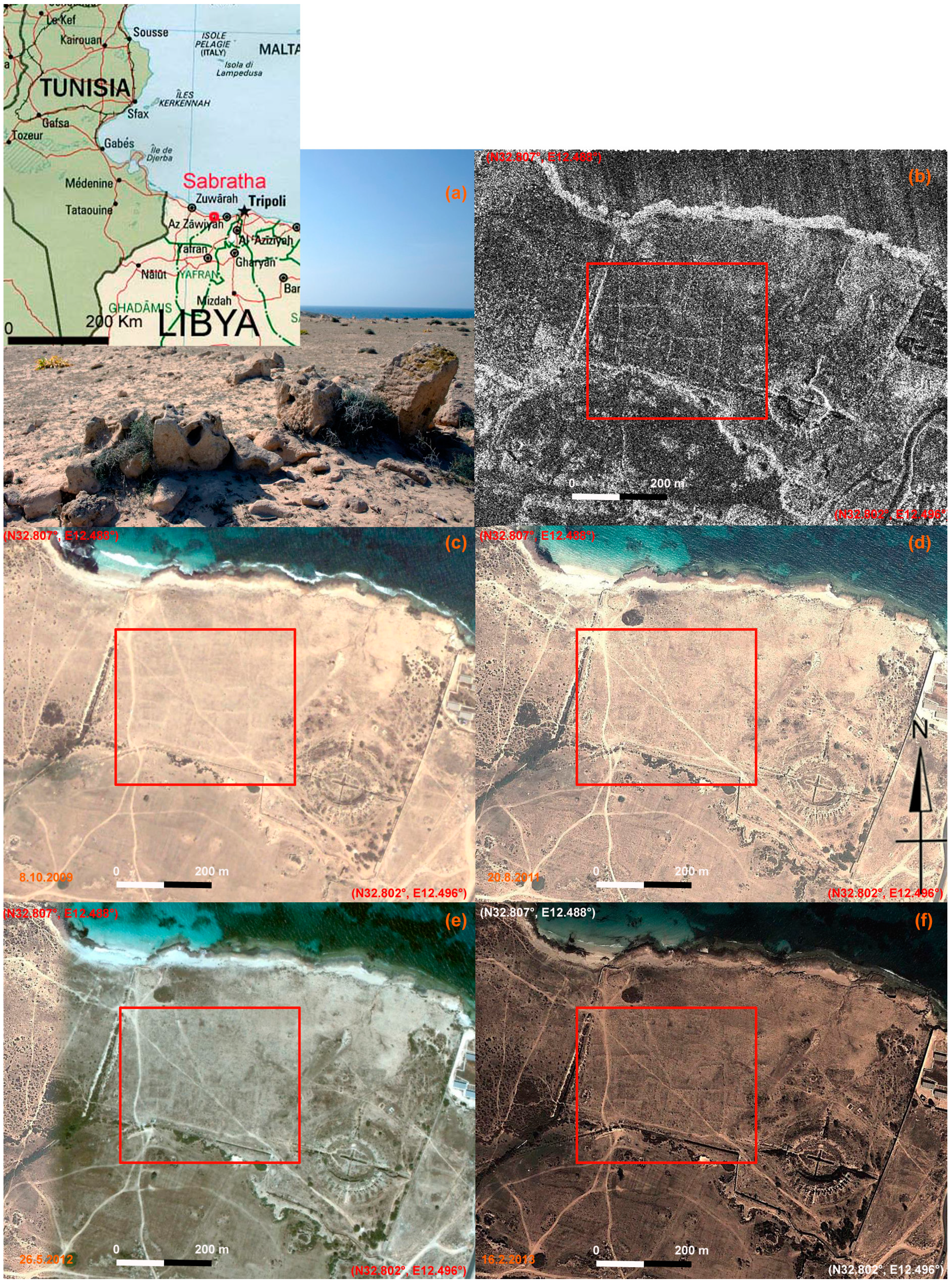 Detecting unknown archaeological features in Sabratha (Libya). (a) detail of an area characterized by the presence of micro-relief and traces of archaeological interest; (b) The archaeological features are clearly visible from the COSMO-SkyMed Spotlight image acquired on 12 December 2012, at 1m geometric resolution, in ascending orbit, with an angle of incidence of 27.320° and HH polarization; (c–f) Google Earth scenes on 8 October 2009, 20 August 2011, 26 May 2012 and 16 February 2013. The red boxes indicate the area with micro-relief (or shadow marks) whose visibility is less than in the Spotlight image in three of them (October 2009, 20 August 2011, 26 May 2012) and similar in one of them (16 February 2013).