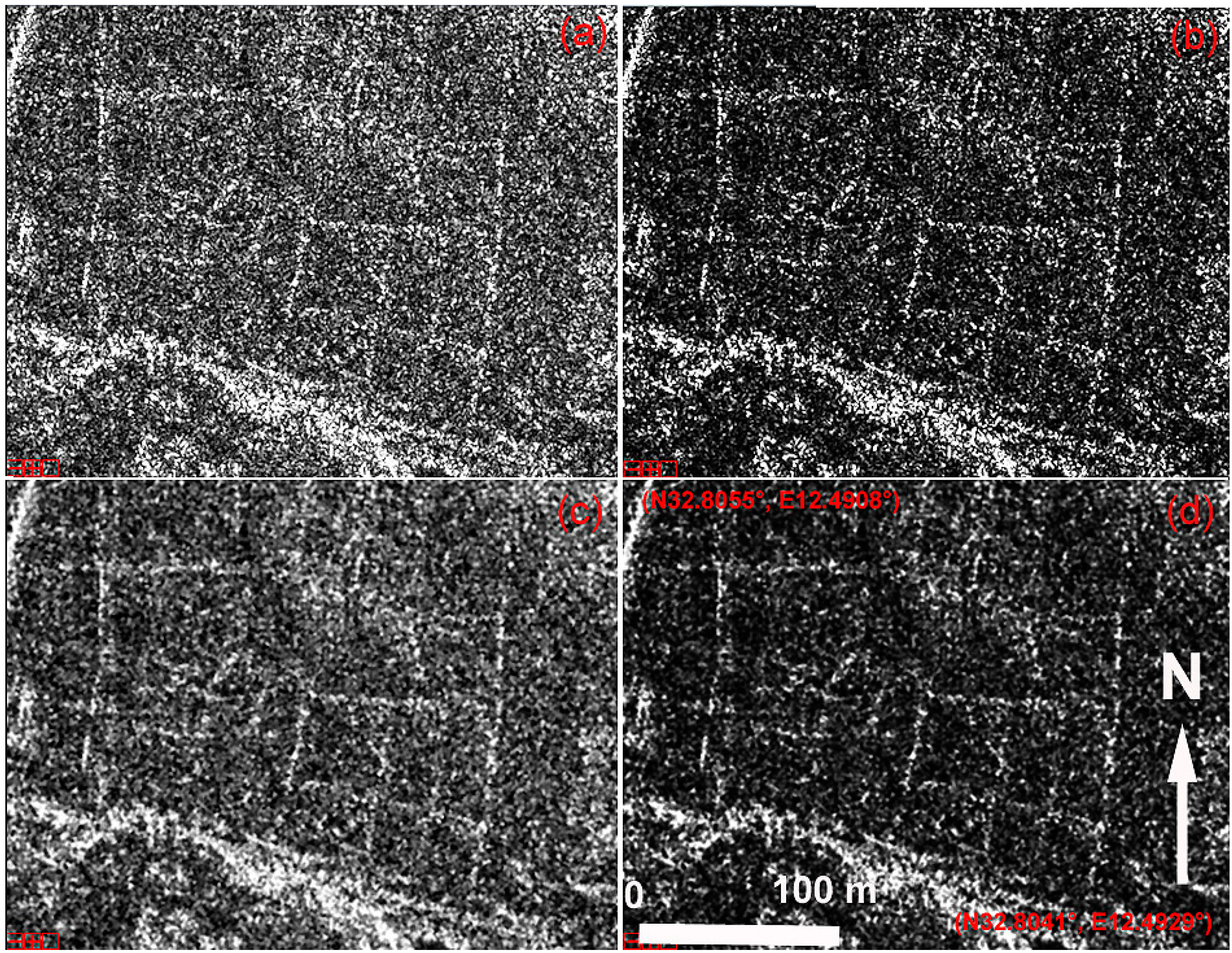 Sabratha (Libya): Enhancement of the COSMO-SkyMed Spotlight scene in the red box in Figure 12. In detail: (a) raw data; (b) Sum^2; (c) enhanced Lee filter; (d) SUM^2 of the enhanced Lee filter result.