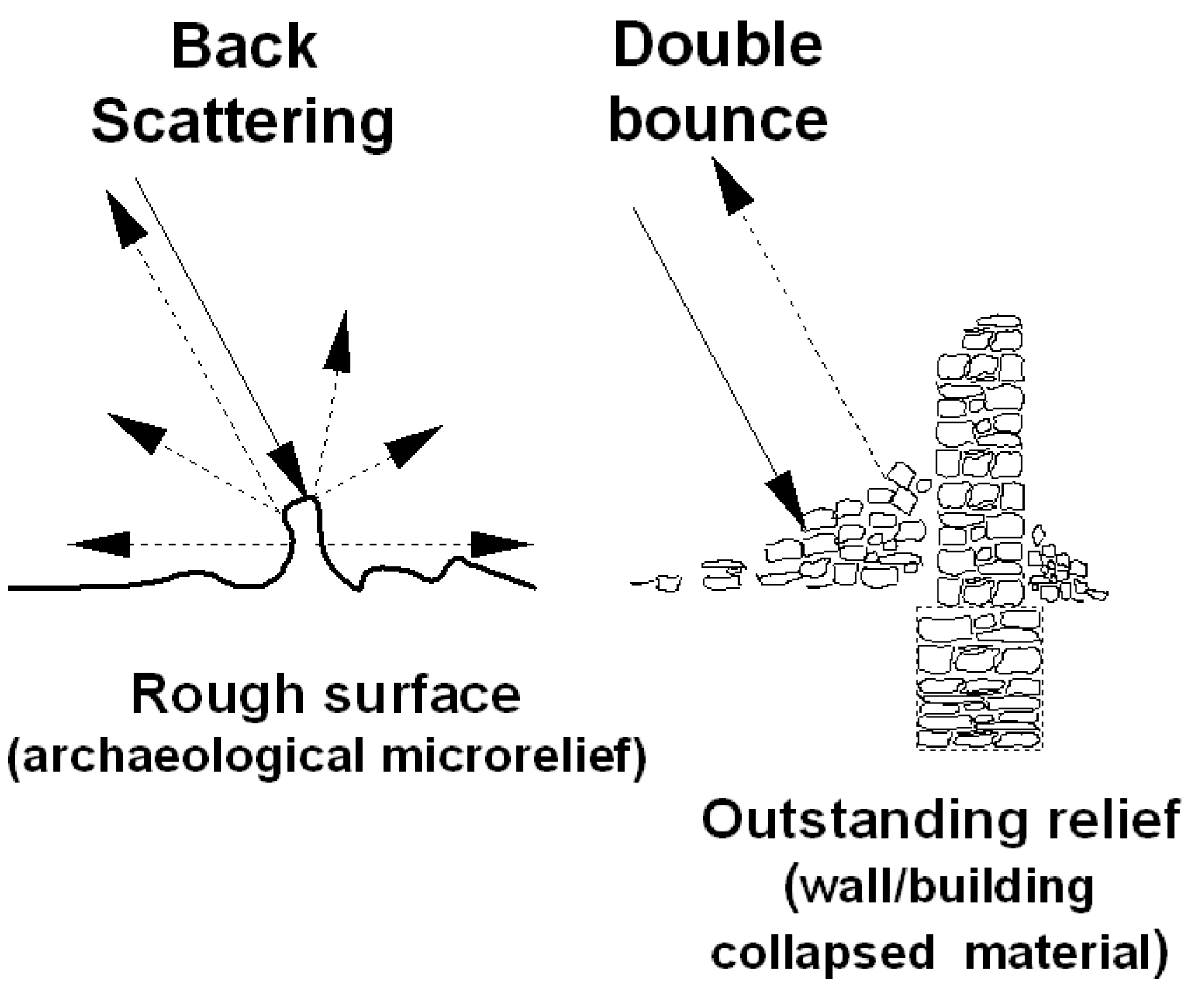 In optical images, shadow marks can be seen in the presence of micro-topographic relief variations that can be made visible by shadowing in low sunlight angle conditions. On the other hand, in radar data, true shadows are very rare at commonly used angles of incidence. Only very steep slopes cause shadows. Therefore, archaeological microrelief (or shadow marks) are usually identifiable from surface roughness. Finally, geometric shapes facilitate the interpretation of the surface roughness as potential archaeological patterns.