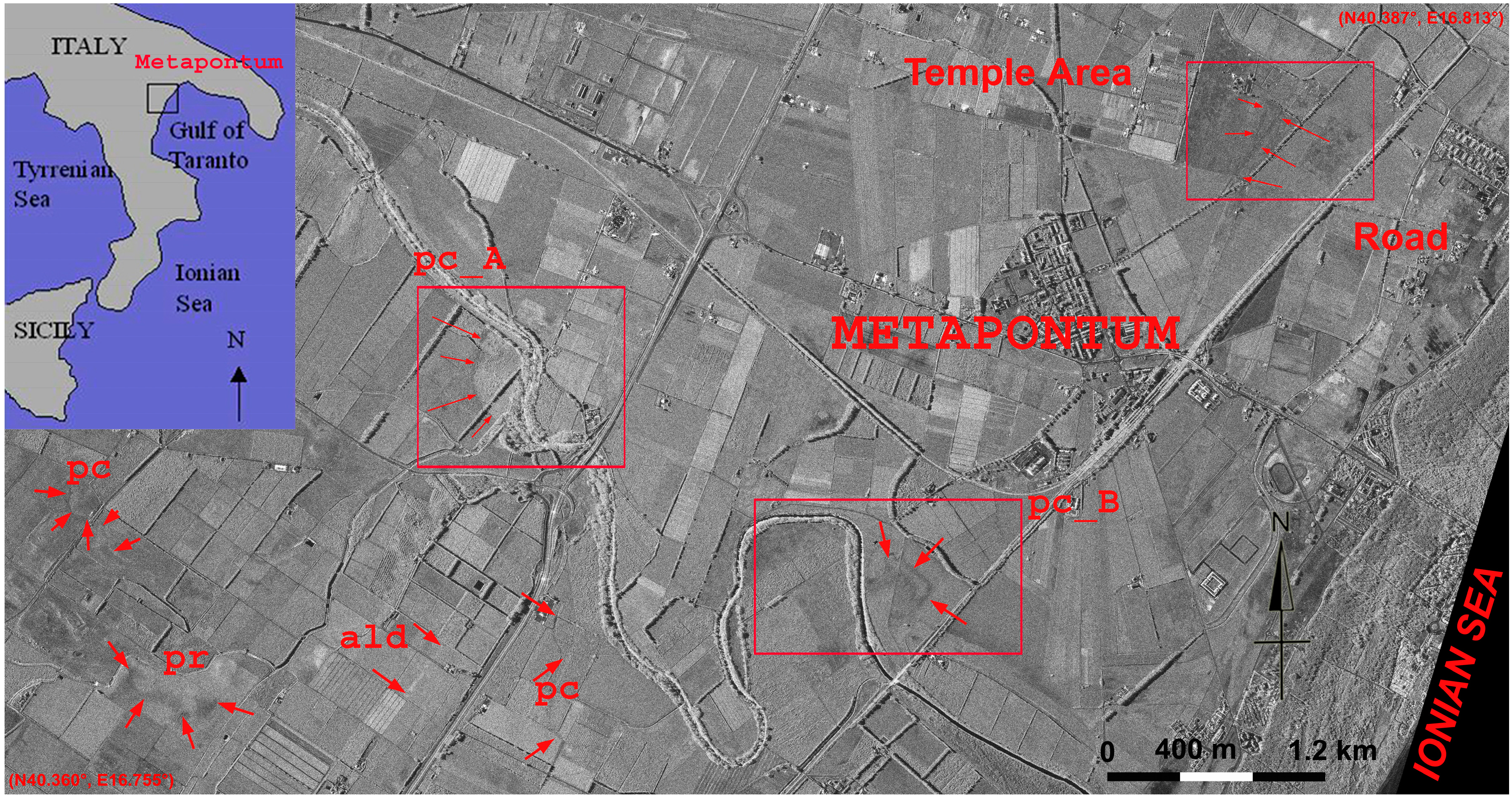 Metapontum (Southern Italy): a number of archaeological and palaeoenvironmental features are visible from the COSMO-SkyMed Spotlight image acquired on 14 November 2011 at 1 m geometric resolution, in a descending orbit, with an angle of incidence of 41.5° and HH polarization. The image shows palaeoriverbeds (pr), palaeochannels (pc), ancient land divisions (ald) and ancient roads. Red boxes denote the three investigated areas in relation to an ancient road and the palaeochannels A and B (indicated as pc_A and pc_B, respectively; see Figure 15, Figure 17 and Figure 19). Upper left : location of Metapontum in Southern Italy.