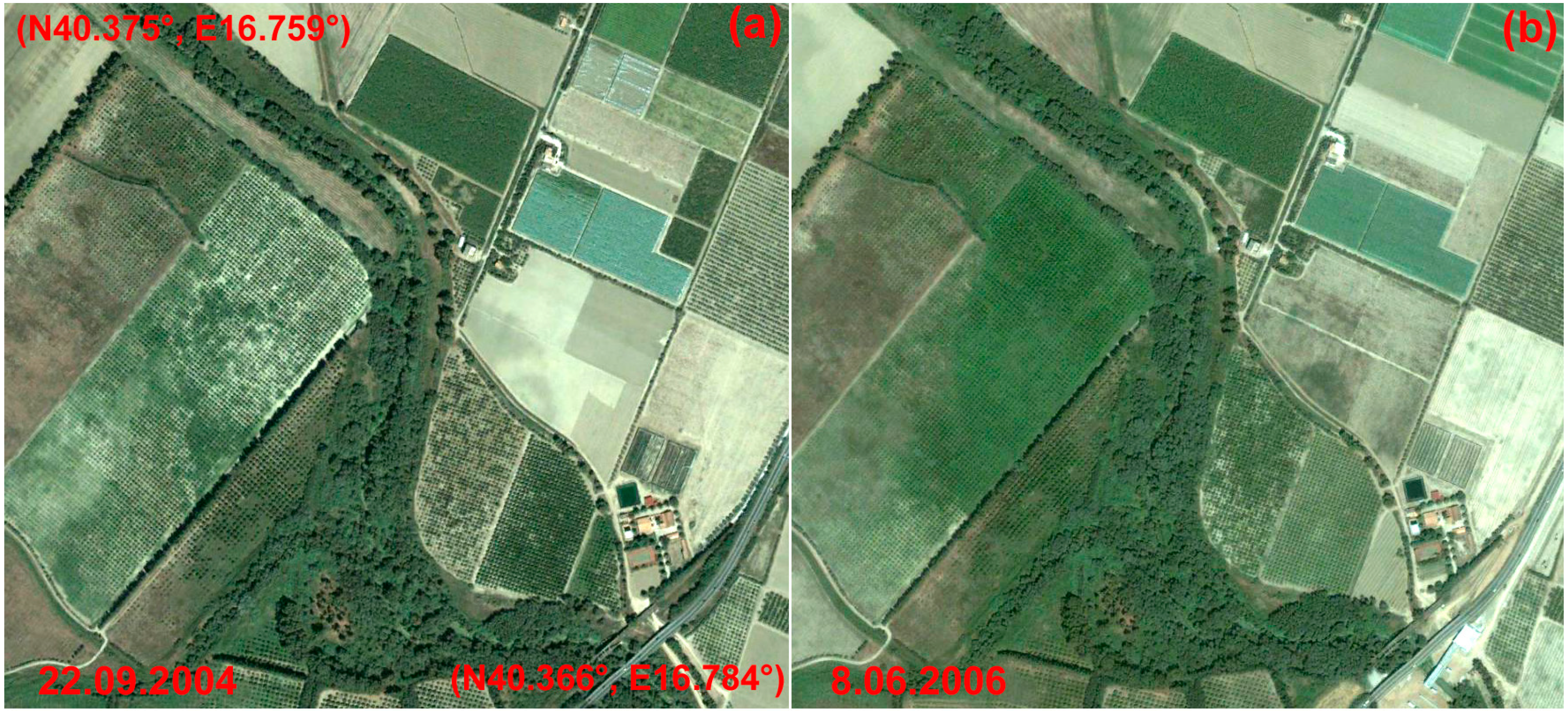 Lastly, the multi-temporal image set of Figure 19 centers on an ancient road in the urban fabric of Metapontum. In this case, the soil marks of this feature are more visible from the Google Earth scenes than from the unprocessed and processed COSMO-SkyMed Spotlight images (Figure 20).
