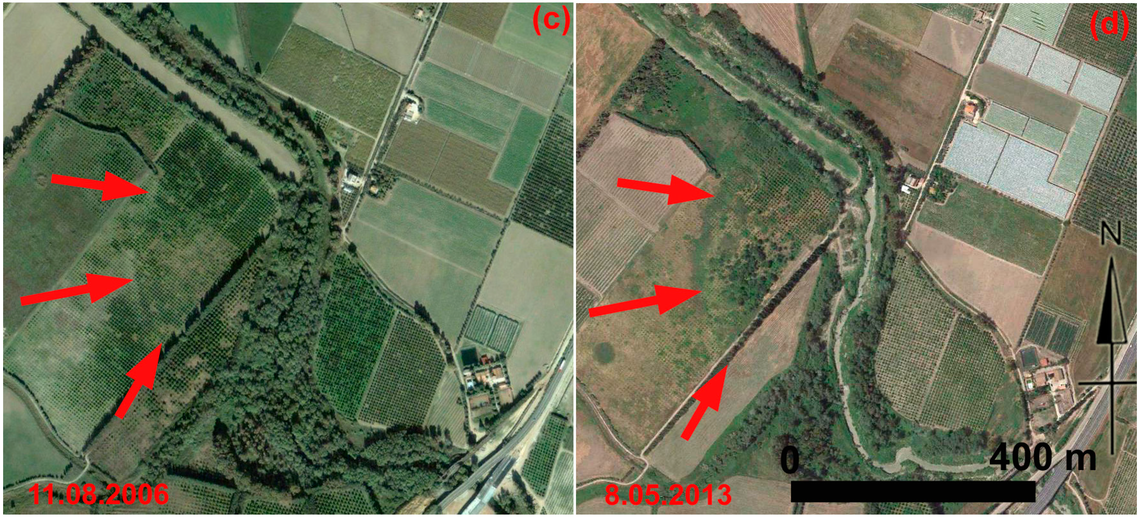 Metapontum (Southern Italy): multi-temporal data set available from Google Earth of palaeochannel B (see pc_B in Figure 14). The visibility of the palaeochannel B changes seasonally depending on moisture content and vegetation cover. It could be observed thanks to damp marks in the summer scenes shown in Figure 17a–c. Crop marks are visible in the spring picture acquired in 2013 (Figure 17d).