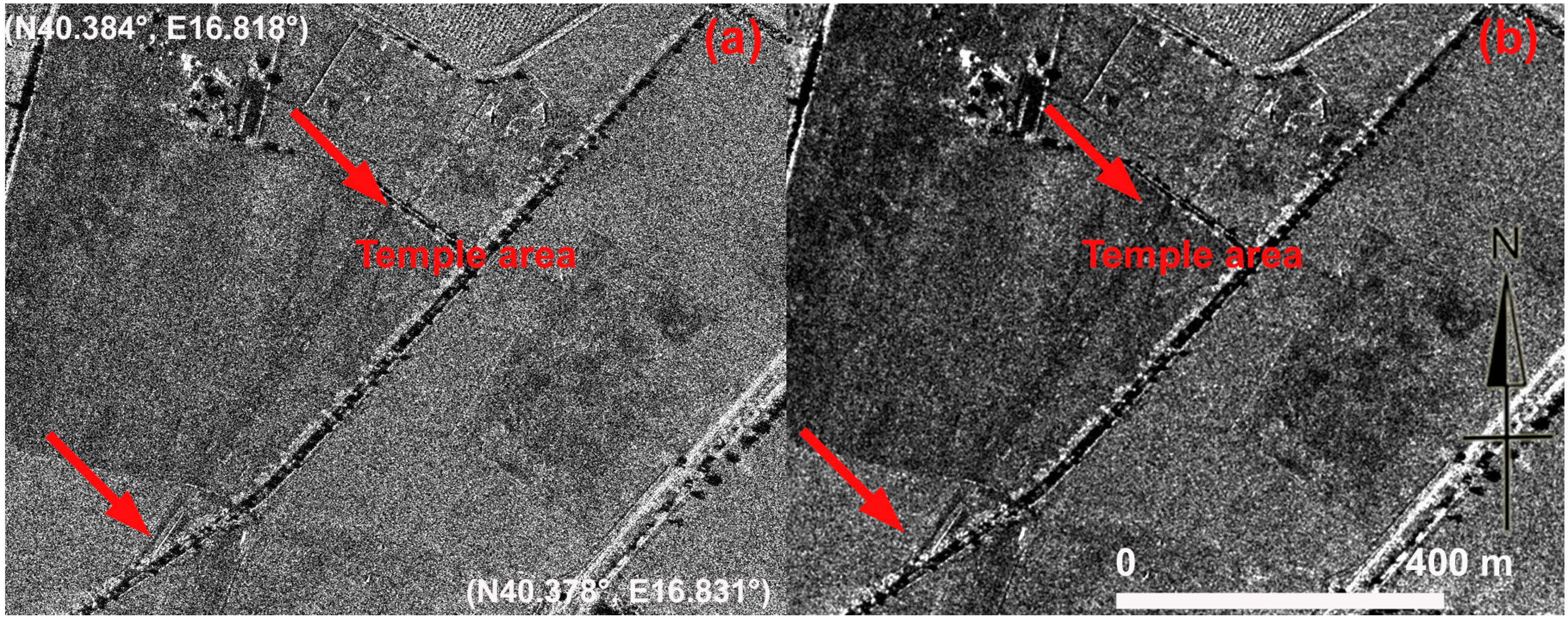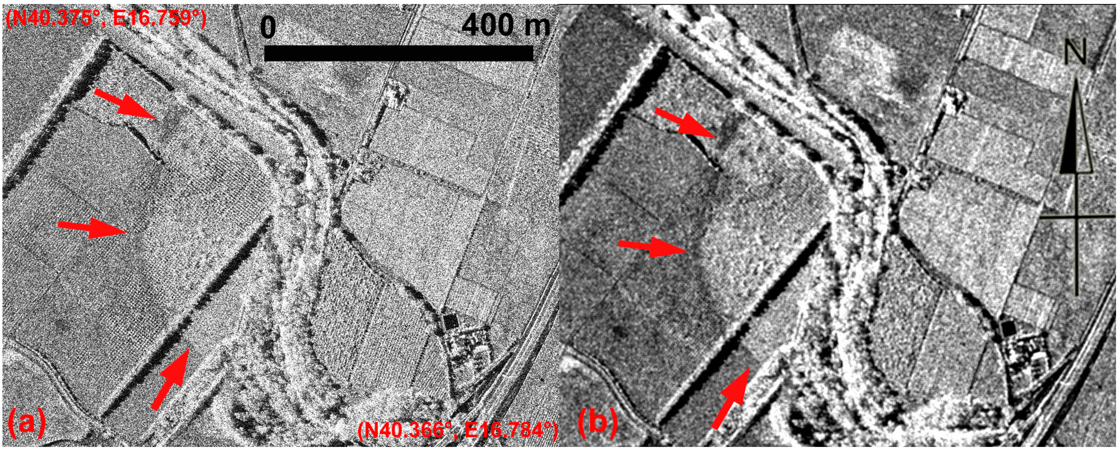 Metapontum. (a) The temple area and road in the ancient Greek town observed from COSMO-SkyMed Spotlight image; (b) enhancement of (a) result of the sum of squares of the Lee algorithm product.