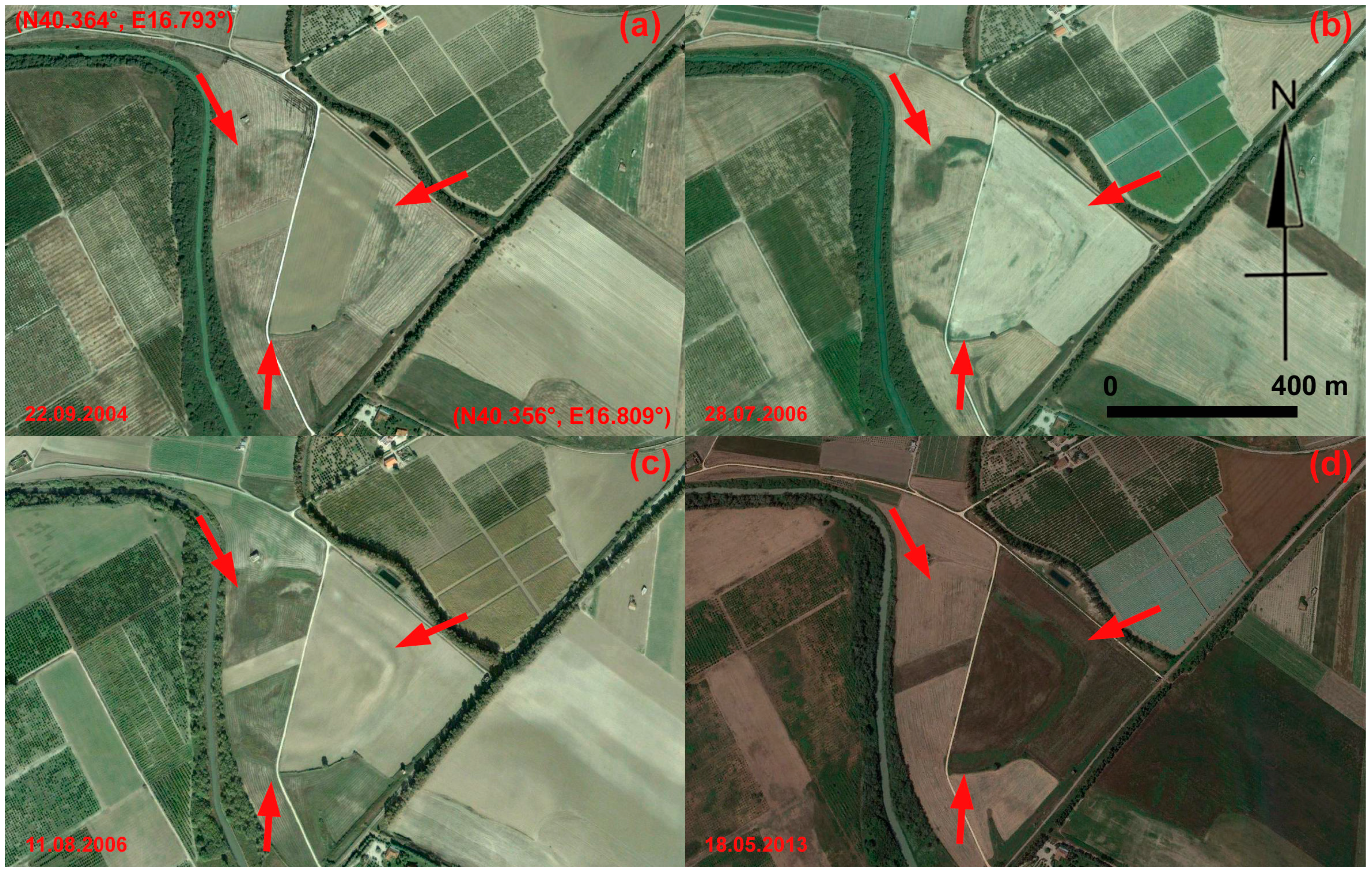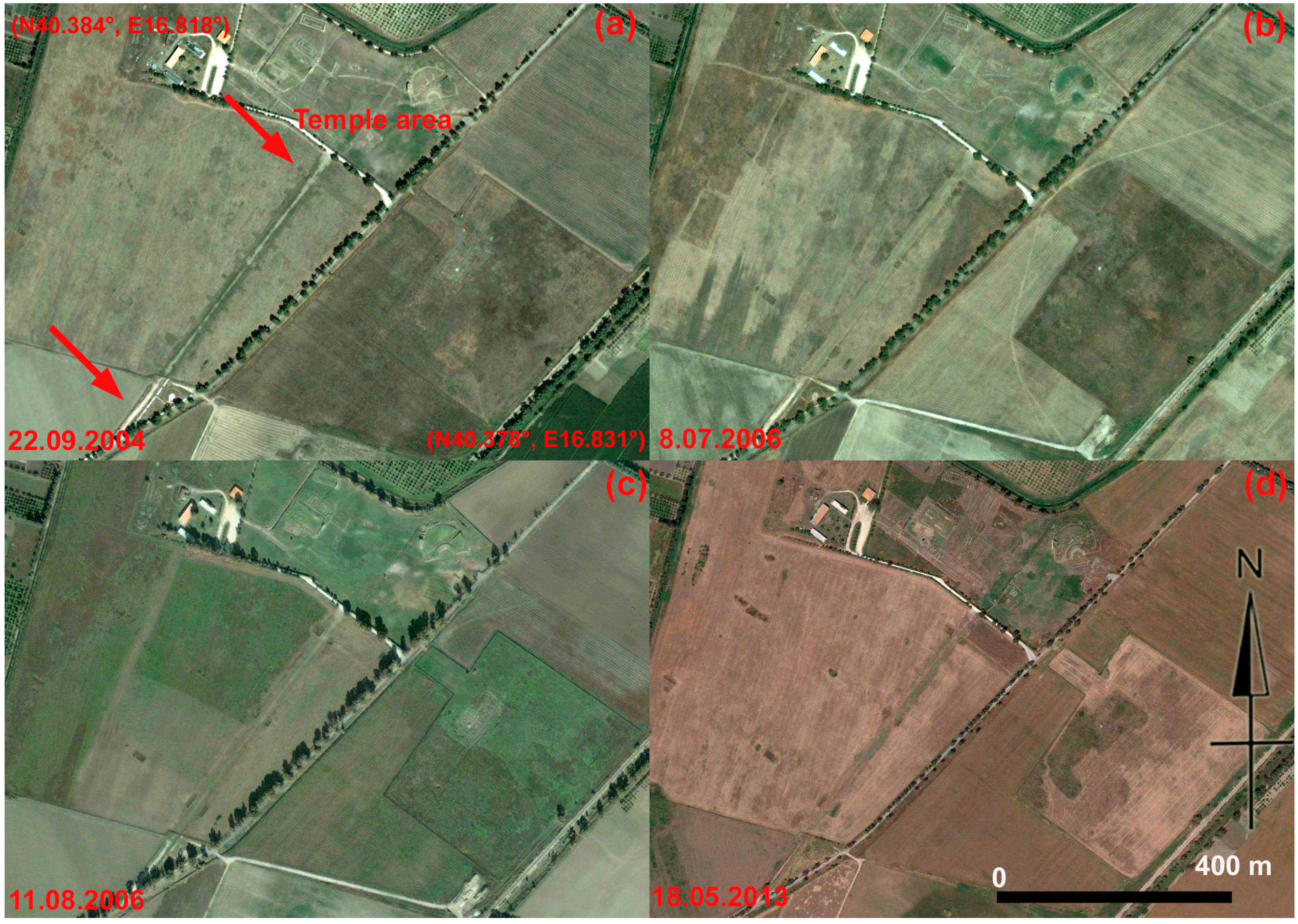 Metapontum: the temple area and a road (indicated by red arrows) in the ancient Greek town. Google Earth scenes were acquired on: (a) 22 September 2004; (b) 8 June 2006; (c) 11 August 2006; (d) 8 May 2013.