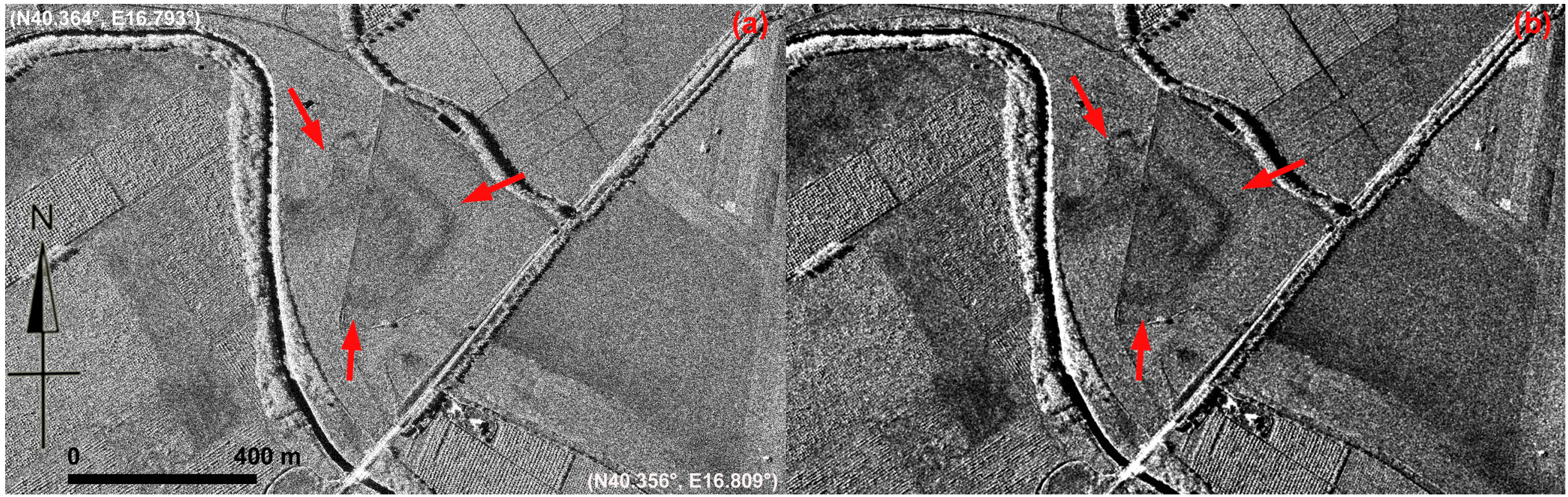 Damp marks appear on bare ground because buried archaeological remains can alter drainage capability and, in turn, water distribution. The detectability of damp marks is linked to soil type, climate and meteorological conditions, and therefore to acquisition time as well as to the spatial distribution and nature of the remains. Damp marks in SAR images are indicated by backscattering anomalies induced by moisture variation that determines the amplitude of the dielectric constant of soil. Increasing moisture may lead to an increase in radar backscattering due to the increase in the soil’s dielectric constant, while small ponds of water formed by heavy rain can increase specular reflectance locally (i.e., scattering on a nearly smooth surface) on the surface and therefore result in a dark area in the SAR image. Consequently, these marks may be more noticeable after heavy rain because the difference in the soil moisture between the underlying archaeological remains, and surrounding surfaces may be highlighted.