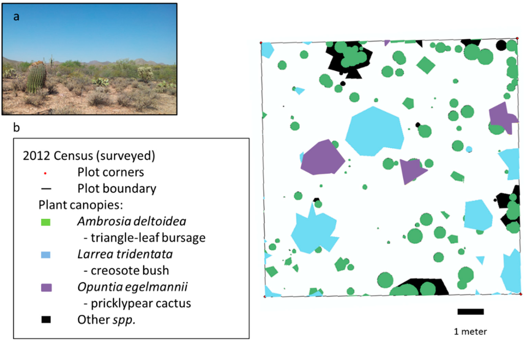 Perennial plants have been censused in eighteen permanently-marked 10 m × 10 m plots at the Desert Laboratory in Tucson, Arizona (32°13′N, 111°00′W) at various times since 1906 [,]. The Desert Laboratory receives biseasonal precipitation, split nearly equally between the summer and winter months, and it has a mean annual precipitation of 298 mm. Plot 4, the plot analyzed in this study, is located on an alluvial plain on the west side of the Desert Laboratory at an elevation of 727 m and has an area of 98.2 m2. This plot is relatively level, has a gravelly sandy loam soil, and has a plant community dominated by Ambrosia deltoidea (triangle-leaf bursage), Larrea tridentata (creosote bush), and various cacti, including Opuntia engelmannii (pricklypear) (Table 3 and Figure 1). Since 1968, species cover on the plot has ranged between: <10%–30% for Ambrosia deltoidea, 2%–9% for Larrea tridentata, and 0%–3% for Opuntia engelmannii (Table 1). Larrea tridentata are taller shrubs on the plot with average height of ~1 m, whereas Ambrosia deltoidea and Opuntia engelmannii are smaller-statured with average height closer to a half-meter (Table 3).