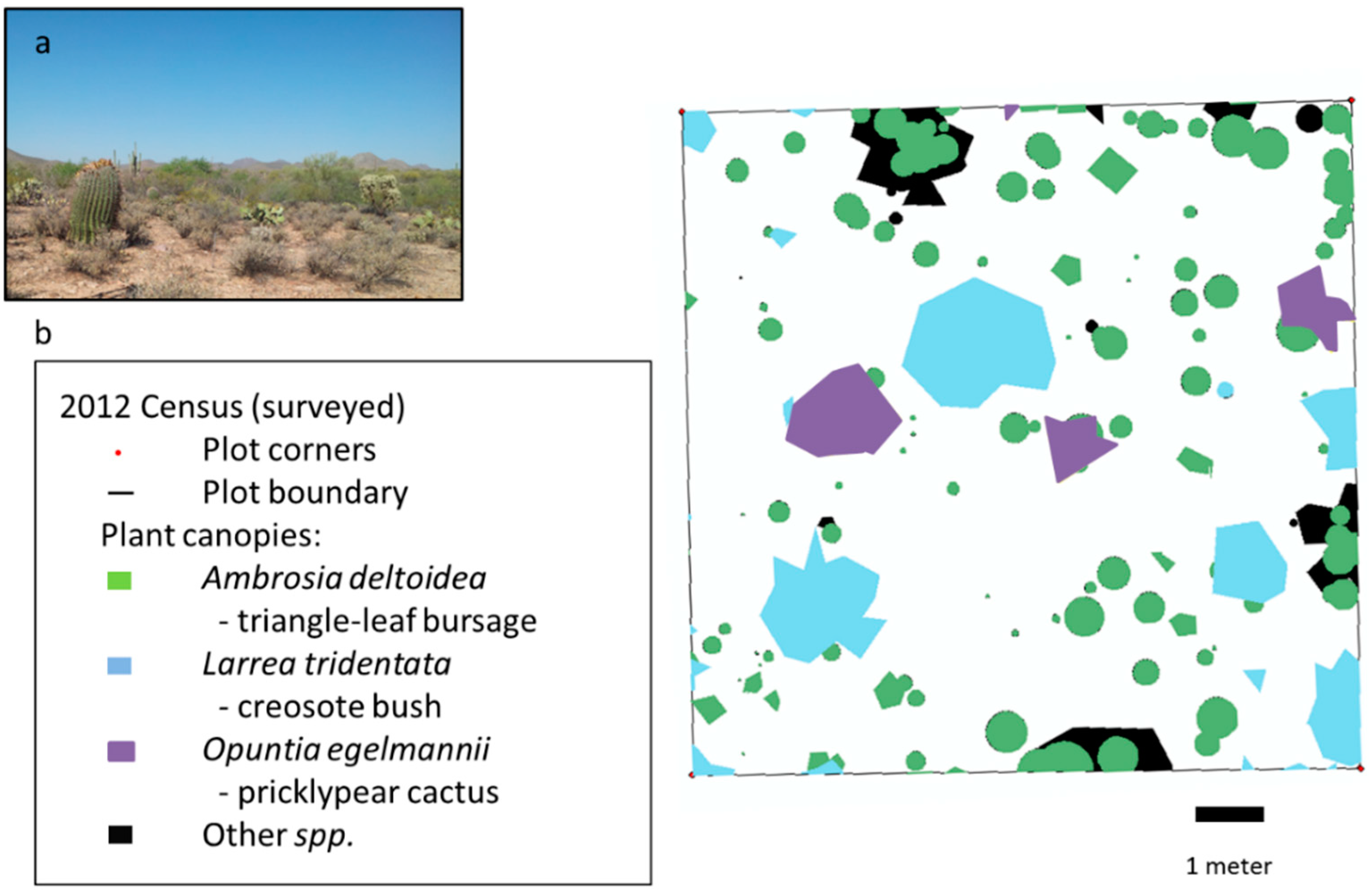 (a) photo of vegetation in the study area; and (b) map of surveyed plant canopies from the 2012 census of plot 4 at the Desert Laboratory in the Sonoran Desert; Individual plants of the three dominant species are identified in (b).