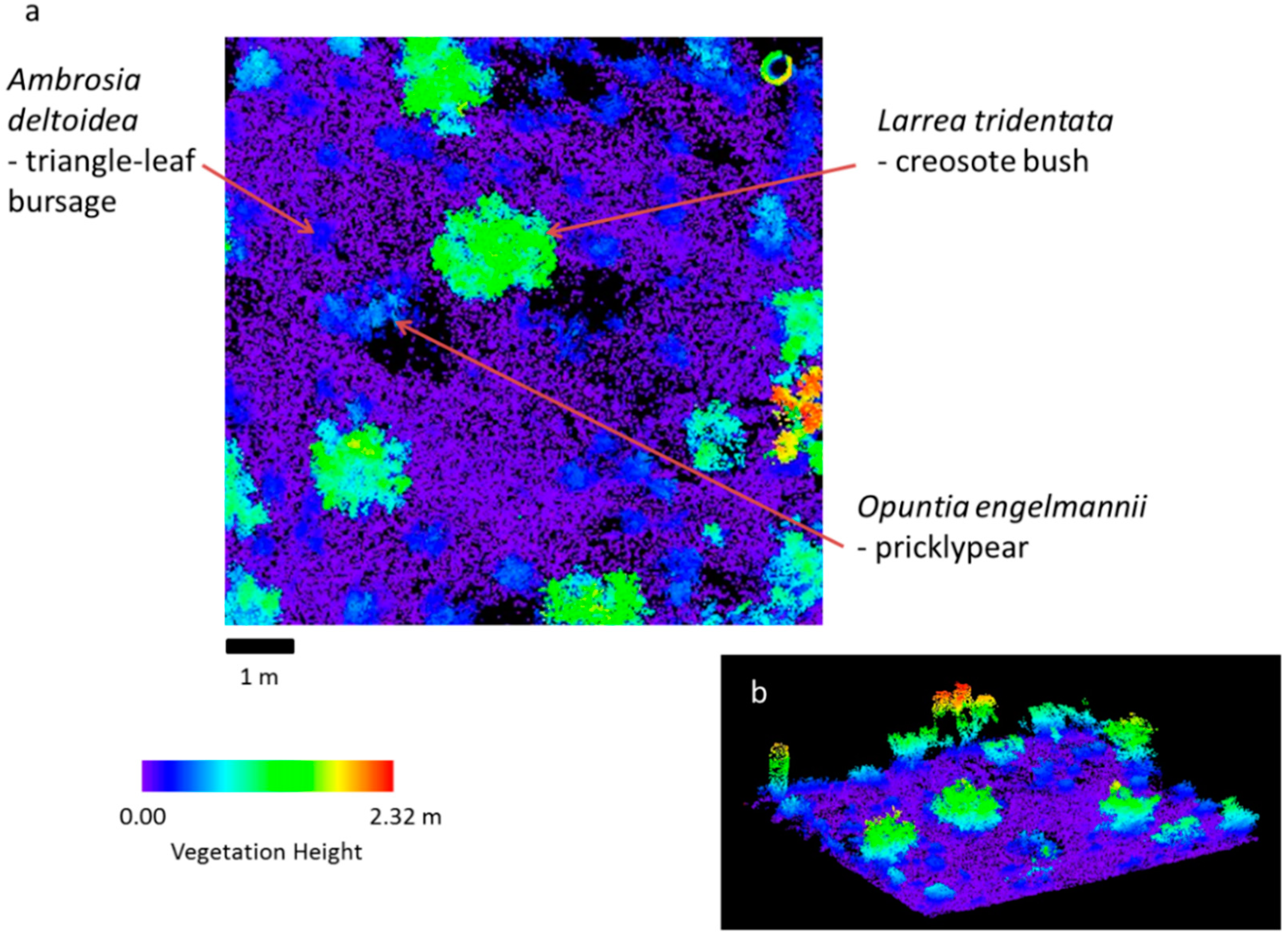 In addition to assessing intra-annual patterns, LiDAR may show utility at measuring vegetation structural changes at annual to decadal scales. Cover of the short-lived shrub Ambrosia deltoidea responds to annual precipitation [40], and there have been several mortality and new recruitment events tracked by the long-term census maps (Table 1 and Table 2; Bowers, 2002, 2005). Cover of long-lived Larrea is sensitive to winter precipitation over decadal scales and this response is highly dependent on landform and soil development, whereas cover of cacti has increased over decadal scales in response to warming temperature [2,40]. LiDAR can likely be used to track these vegetation structural changes at longer time-scales. However, our results indicate that careful consideration should be made to the time of year or the phenological stage of vegetation before conducting a repeat measurement.