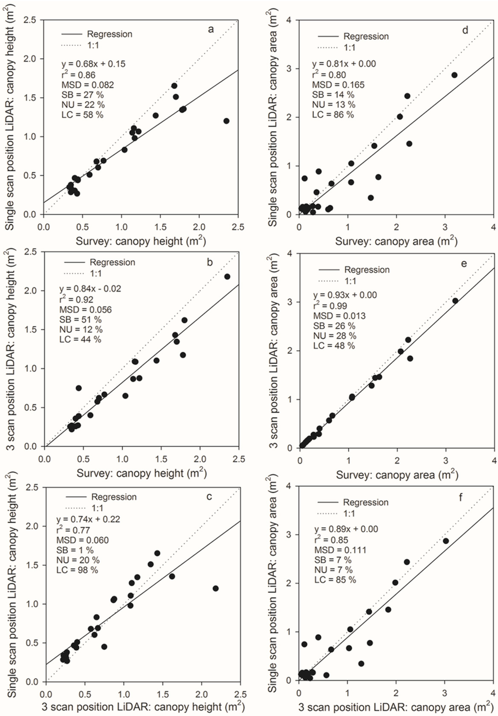 Relationships of LiDAR measurements performed from one scan position or three scan positions and total station survey for canopy height (a–c) and area (d–f) of individuals within the study plot. MSD is the mean squared deviation and has components of standard bias (SB), non-unity (NU), and lack of correlation (LC).