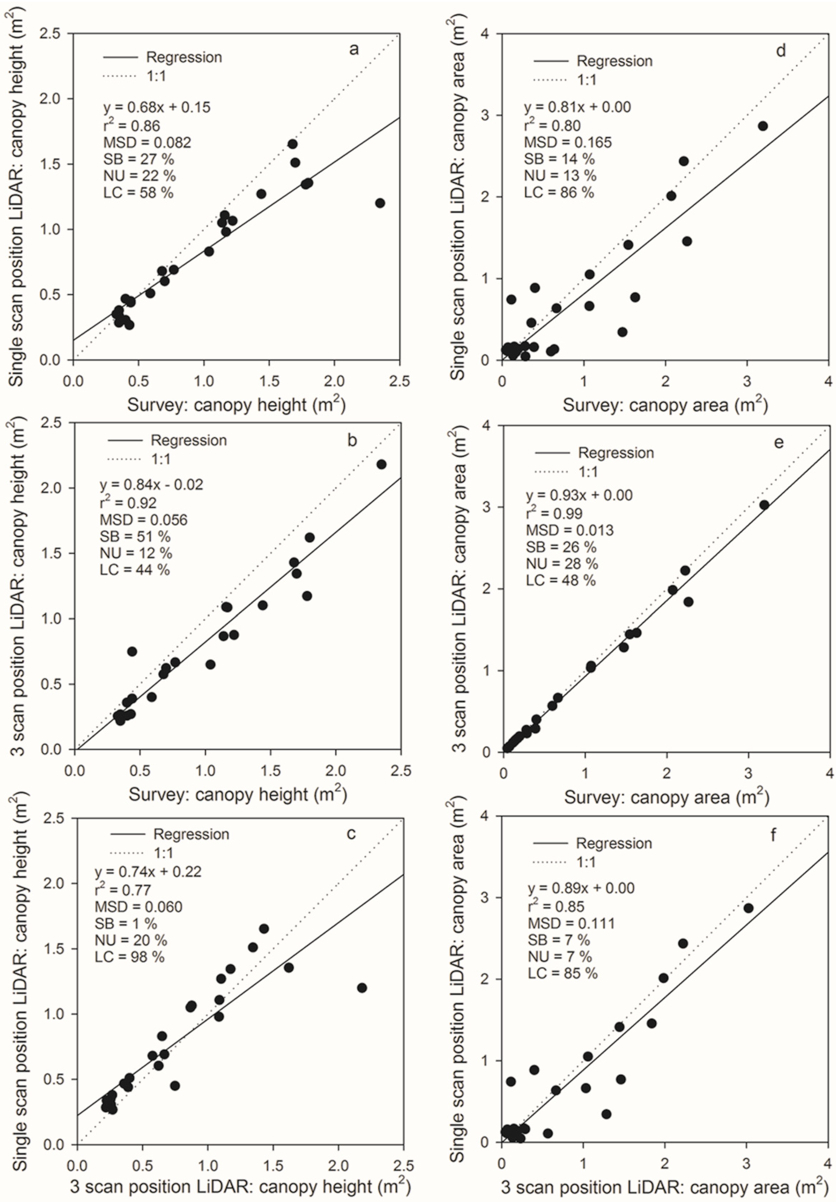 LiDAR canopy height and area measurements were strongly related to the survey measurements (Table 3, Figure 3a–e) with r2 between 0.80 and 0.99. LiDAR measurements collected from a single scan position and three scan positions were strongly related (Figure 3c,f) with r2 of 0.77 and 0.85 for measurements of canopy height and area, respectively. For comparison of most pairs of datasets (Figure 3) the greatest proportion of the MSD was attributed to the scatter of points about the regression line (i.e., LC), as opposed to deviances in the slope or intercept from the 1:1 line (SB or NU, respectively). In general, deviations from the 1:1 line indicated that LiDAR tended to slightly under-predict survey measurements of canopy height and area (Figure 3a–e). The greatest departure in accuracy in terms of scanning from a single position was for the LC, and not the SB or NU components–which indicates overall scatter contributing to a lack of correlation and not a bias in the slope or y-intercept–relative to the presumably more accurate three-scan position LiDAR (Figure 3c,d). Scanning the plot from three positions took approximately three times longer than scanning from a single position.