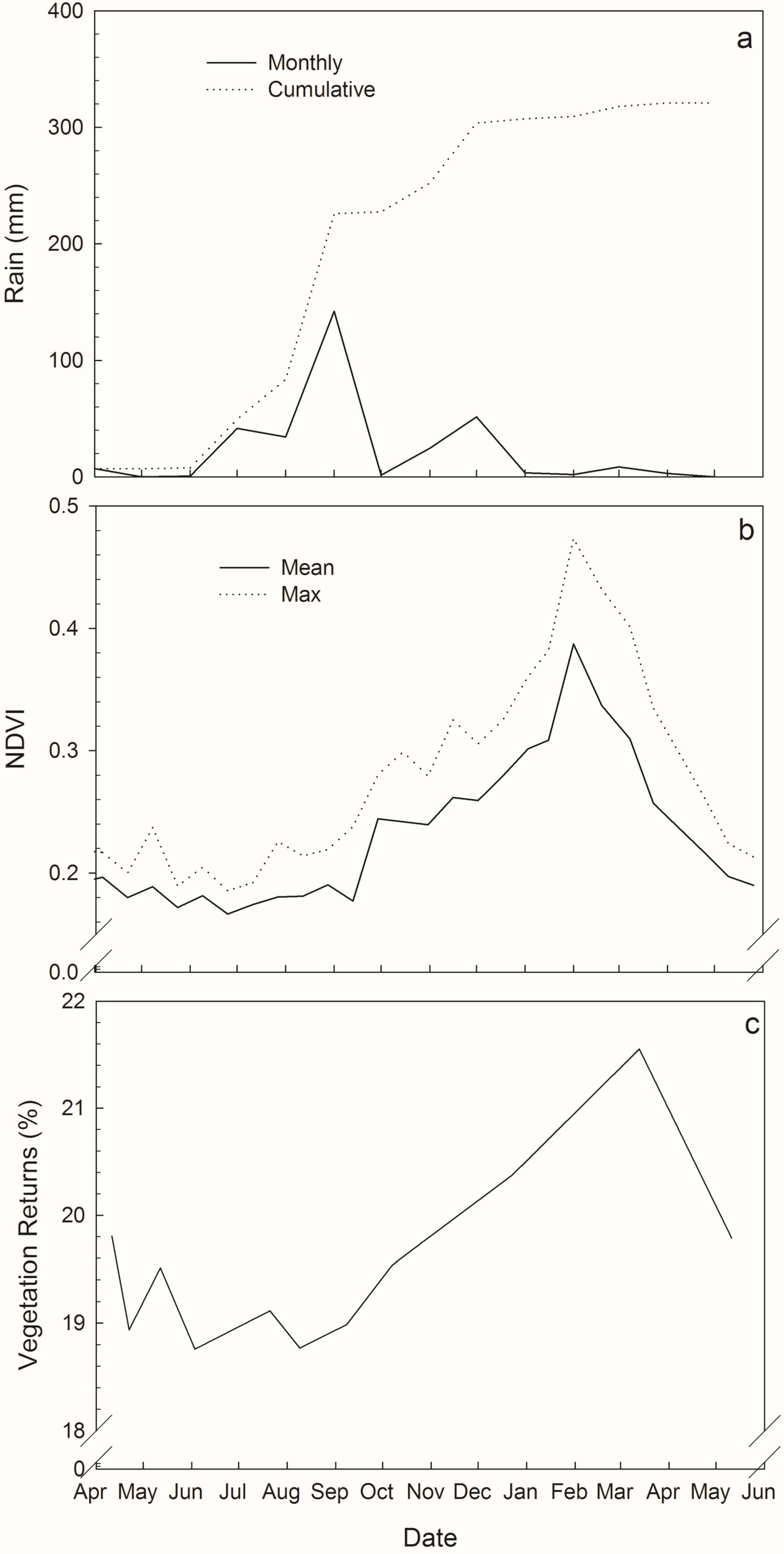 A consistent positive trend in the percentage of LiDAR returns from vegetation occurred across the plot after August 2011, corresponding to the monsoon season, followed by a subsequent decrease after April 2012 (Figure 4c). Percentage of LiDAR returns from vegetation was positively and linearly correlated with NDVI (r = 0.90, p < 0.001). LiDAR returns were not, however, significantly correlated with monthly or seasonal rainfall (all p > 0.10).