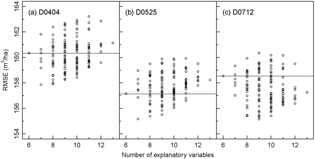 Relationships between RMSEs of stand volume estimates and the number of explanatory variables for Analysis 1: (a) D0404; (b) D0525; (c) D0712. The RMSEs for six variables indicate the results from the basic models (spectral data alone), and the RMSEs for 13 variables indicate the results from all spectral data and environmental factors; the horizontal lines show the RMSEs of the estimates using basic models.