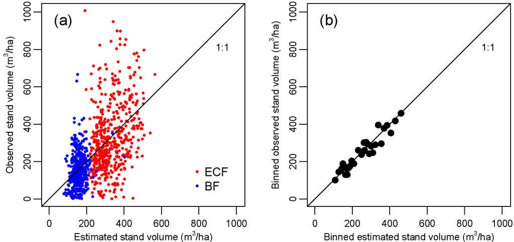 where yi is the observed volume of the validation data i, ŷi is the estimated volume of i, n is the number of validation data and is the mean of the observed stand volume. In accordance with McRoberts [49,54], another accuracy assessment was also performed graphically, taking the relationship between observed stand volume and estimated stand volume by a binned group of n = 30 samples by arranging estimated values in ascending order.