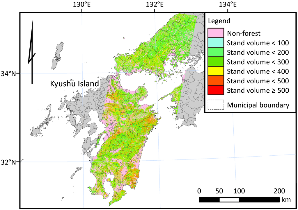 Finally, we created a spatial distribution map of stand volume in the study area. Figure 4 shows a map of stand volume estimated by the optimum combination model for D0525 from Analysis 1. This map clearly shows the differences in stand volume among municipal units, as well as the differences in stand volume within a municipal unit. The map shows that there are many “hot spots” of high stand volume values (displayed with orange and red colors) in Kyushu Island (e.g., stand volume ≥ 400 m3/ha), and the northern region of the study area shows relatively low stand volume.