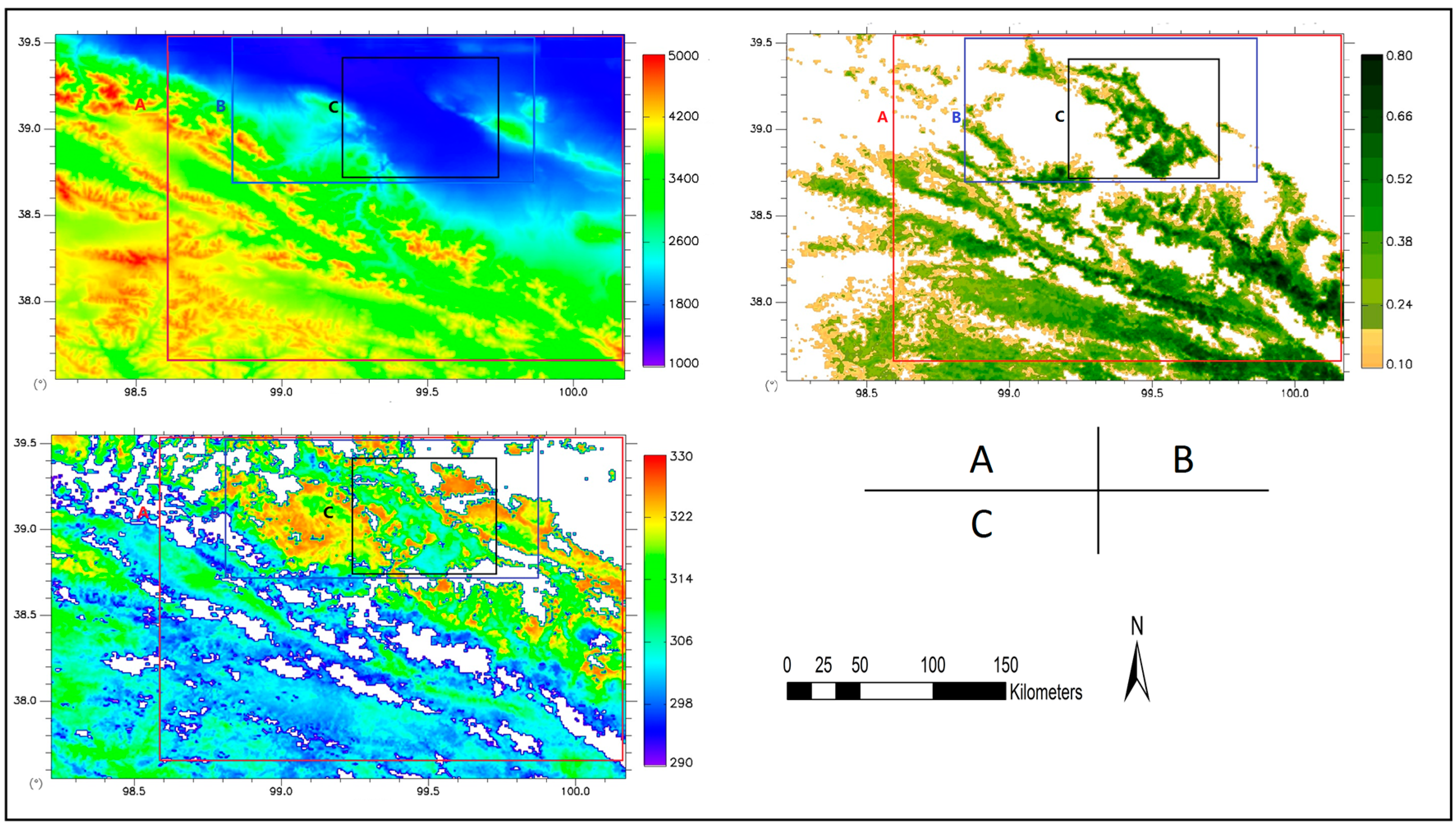 The spatial distribution of (A) Digital Elevation Model (DEM) (unit: m); (B) Fc and (C) LST (unit: K) in the entire study area. The three rectangles (A), (B), and (C) indicate the nested windows to build the LST-Fc feature space.