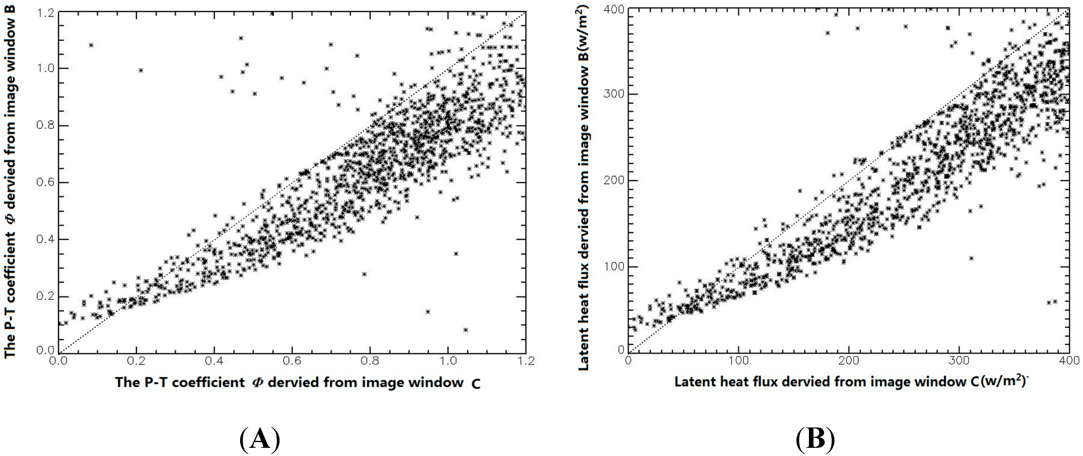 Figure 4B,C, the shapes of the LST-Fc diagrams from sub-regions B and C are obviously different. We used the scatter plot to evaluate the effect of study area size on the coefficient ϕ estimation. The P-T coefficient ϕ based on the image windows B and C as well as the resulting ET are compared and presented in