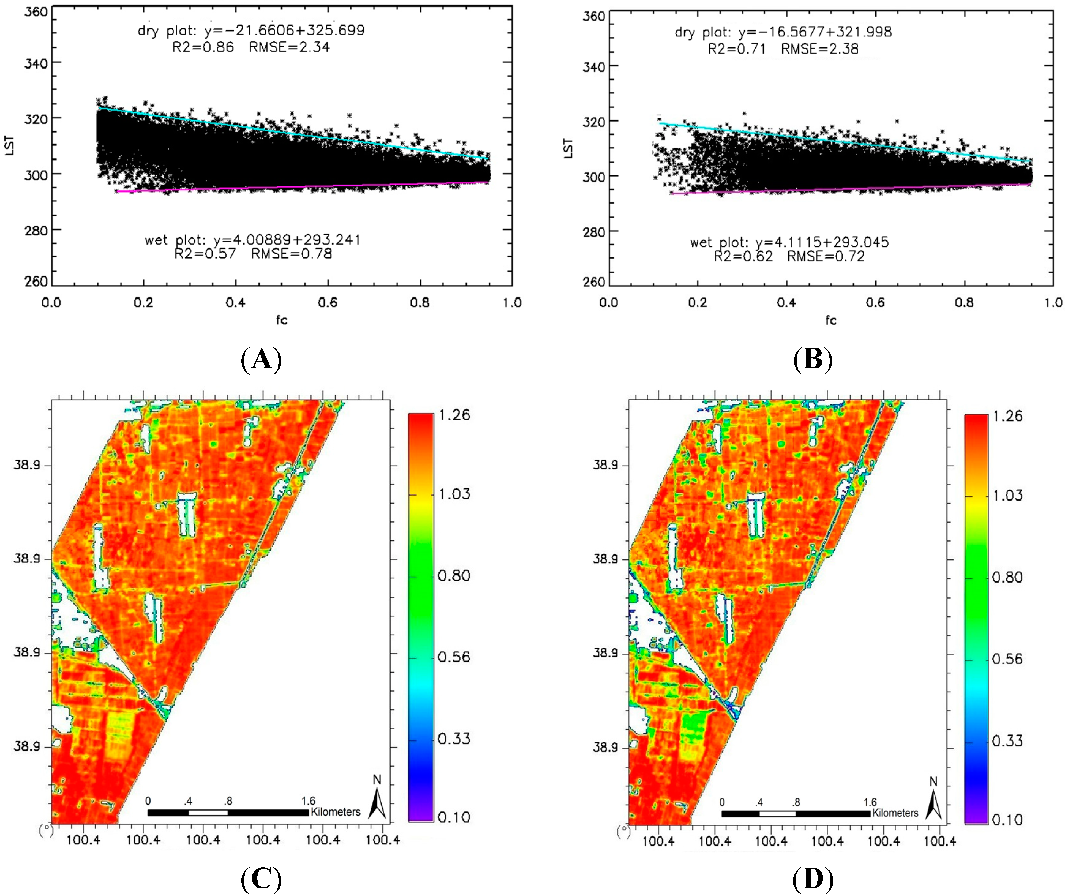 The LST-Fc feature space constructed respectively by: (A) using the WiDAS image, denoted as original feature space; (B) using WiDAS image data without erroneous dry pixels, denoted as refined feature space. (C,D) the results of coefficient ϕ estimated from LST-Fc feature space (A) and (B) respectively.