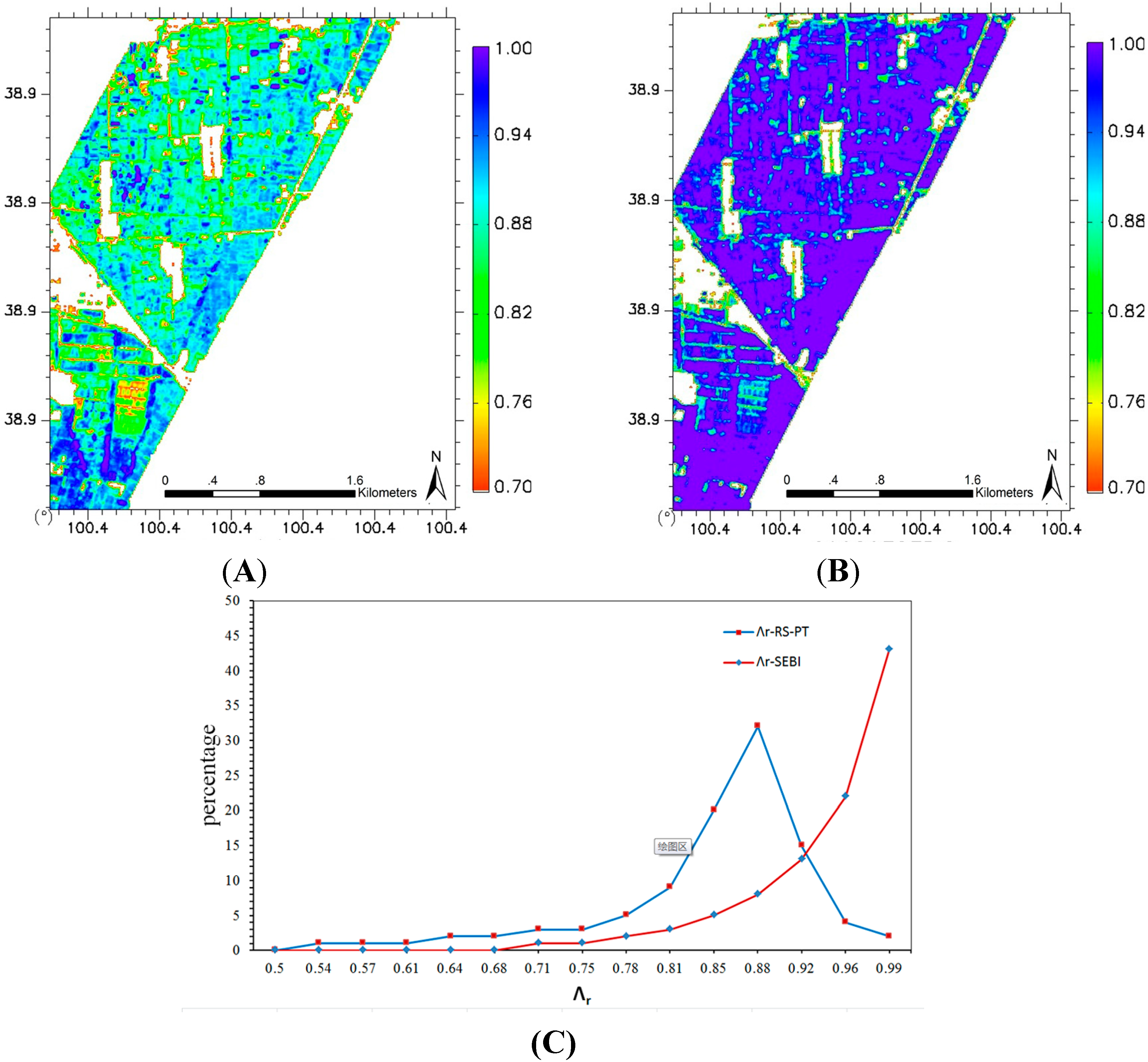 The spatial pattern and frequency curves of Λr from different methods using WiDAS data over Zhangye Oasis on 7 July 2008: (A) Λr is obtained using the LST-Fc feature-space (Λr_RS-PT); (B) Λr_SEBI is obtained based on SEBI (Λr-SEBI); and (C) the frequency curves of (A) and (B).