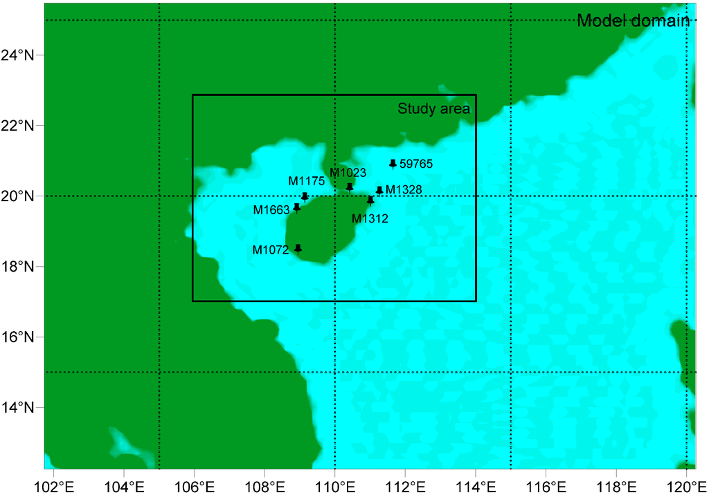 Map of the model domain and the study area with indication of the seven in situ stations.