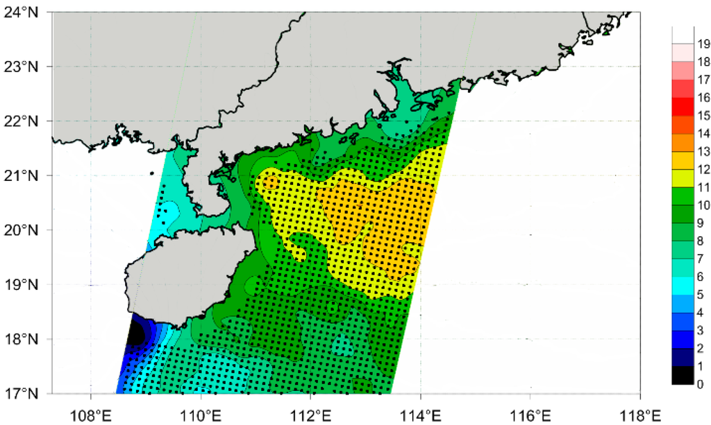 In order to validate the assimilation results, it is necessary to use the independent in situ measurements on ships, lighthouses or buoys over the open ocean. Because of the lack of these measurements in this study, the seven offshore in situ measurements (see Section 2.3) are used in this part. The validation results are listed in Table 8. It shows an obvious improvement of RMSE at most stations (five out of seven) and a small increasing RMSE at M1328 for SAR wind assimilation experiments. Meanwhile, four out of seven stations is characteristic by the obvious improvement of RMSE for ASCAT wind assimilation experiments and the small increasing RMSE found in the other three stations are partly because of the large mask of the scatterometer wind products over coastal seas as shown in Figure 3 which introduced less wind information over the coastal area than SAR wind retrieval. On the other hand, the weak simulation capability of WRF near the coast and islands gives rise to the large deviation in Table 8, which also illustrate that it is a really good idea to assimilate satellite data and even in situ measurements in the future. Overall, the main point shown in Table 8 is that the results improve quite clearly when the satellite data are assimilated.