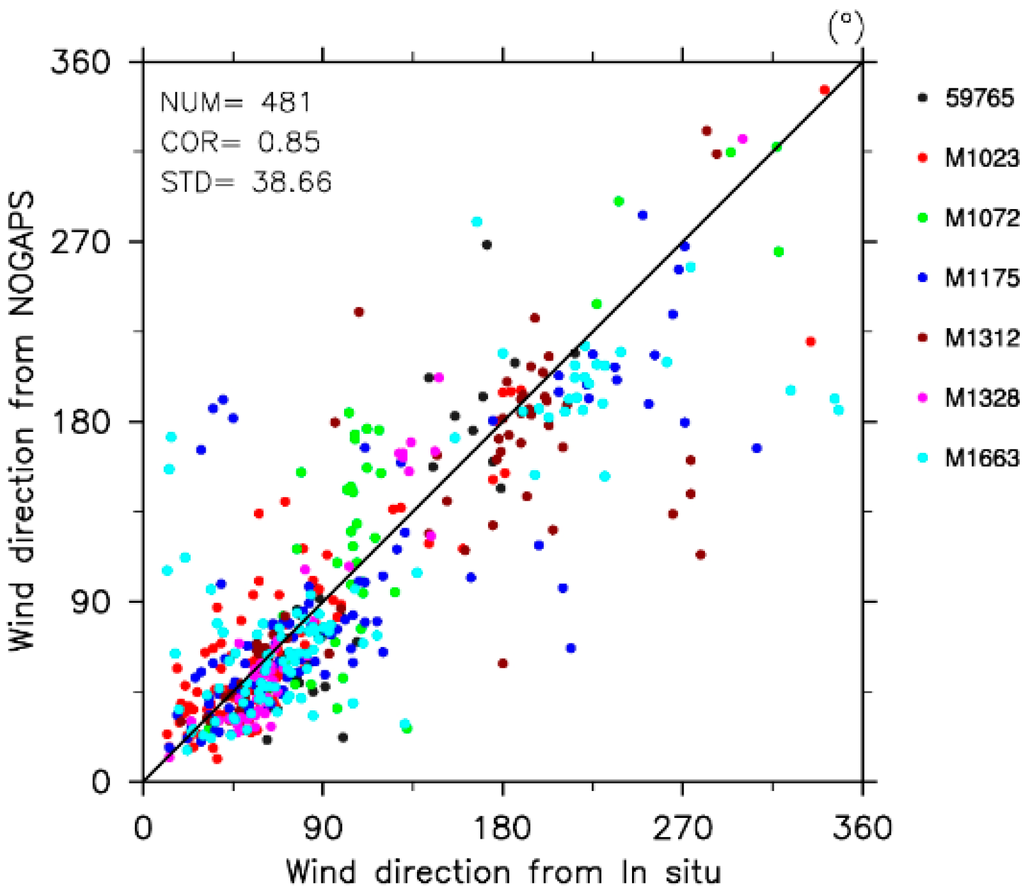 The wind direction in SAR images are from the NOGAPS wind directions interpolated in time and space to match the SAR data. The wind directions from all masts versus NOGAPS are shown in Figure 5, and a few observations near 0° and 360° are removed. The statistical results show a standard deviation (SD) of 38.66° and correlation coefficient of R 0.85. The wind roses of every mast are then investigated (not shown here), and it is shown that the features from NOGAPS are similar to these from in situ measurements, indicating a satisfactory consistency in wind direction at most of the in situ sites except for M1072, partly because of the small statistical number in this site (less than 45). This wind direction uncertainty affects the accuracy of the SAR wind speed retrieval.