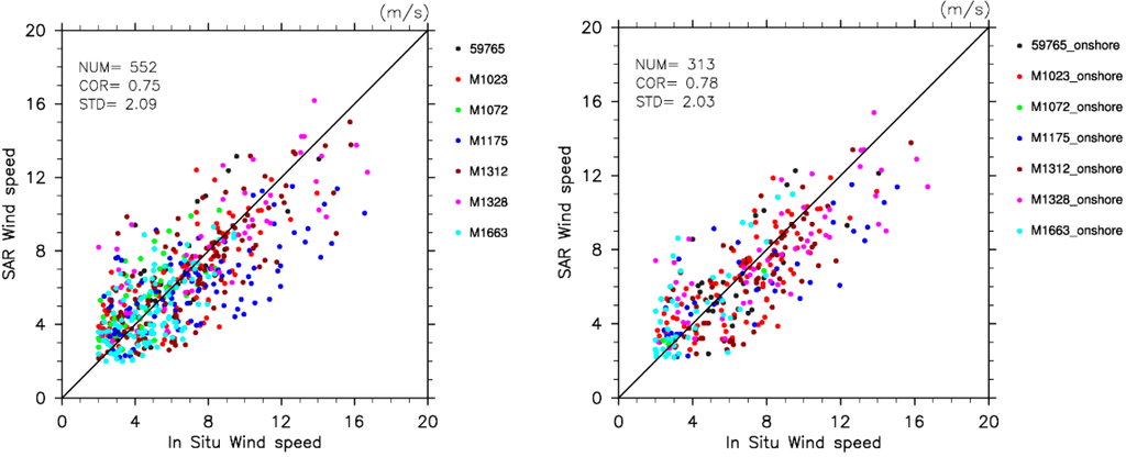 The comparison results on wind speed are calculated for each meteorological station. The overall data are included in the plot between in situ wind speed and SAR-based wind speed shown in Figure 6 (left) and winds less than 2.0 m/s are excluded. Table 5 shows the results of the correlation analyses between them. The correlation coefficients are smaller than 0.8 and standard deviations are larger than 1.8 m/s at most of the meteorological masts. In all, it shows that regression using N = 552 samples of collocated wind speed observed at meteorological stations and SAR-based wind speed results in R = 0.75, SD = 2.09 m/s. The overall mean error in Table 5 is −0.27 m/s, which represents that the SAR winds underestimate the in situ wind speeds a little bit. For the onshore samples (Figure 6 (right)), which means the wind flows from ocean to land, the statistical results show a correlation coefficient of R = 0.78, with a standard deviation of 2.03 m/s, indicating the higher retrieval accuracy of SAR data over the ocean. This phenomenon can be explained in this way: The retrieval of SAR wind is based on the interaction between the sea surface winds and ocean waves, and it can reflect the ocean winds very well. When the wind flows from land to ocean, it holds lots of effects of the land surface, which can impose a negative effect on the comparison results.