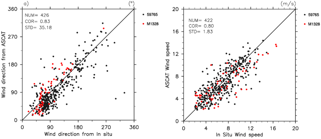 In situ wind directions (left) and wind speeds (right) vs. ASCAT wind.