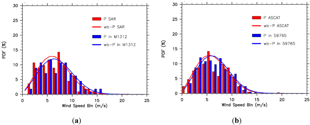 Histograms of in situ winds (red bars) and satellite retrieval winds (blue bars) as well as their Weibull fits (red curves for in situ winds and blue curves for satellite retrieval winds): (a) in situ winds and the co-located SAR winds at M1312; (b) in situ winds and the co-located ASCAT winds at 59765.