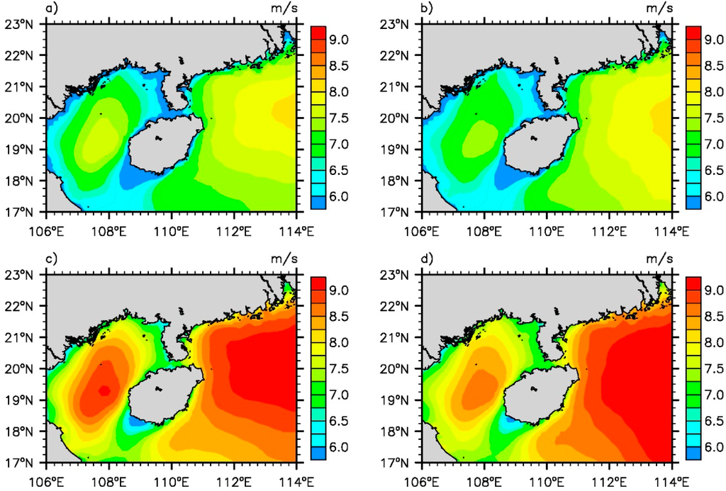 The meteorological observations over SCS is provided by Climate Center of Hainan Meteorological Bureau (see Figure 1 for specific locations), including hourly wind speed and wind direction observed at 10 m from seven in situ measurement stations. The data periods with the first and last observations from each of the seven met-masts used in the comparison study are listed in Table 3. The first four masts are located on islands in the ocean as close as 88 km, 31.5 km, 5.42 km and 2.2 km from the nearest continental coast, all are of relatively high data quality. The three masts from M1312 to M1663 are located on land at 0.05 km, 0.14 km and 0.48 km distance from the ocean. Observational environments of these masts are acceptable, large flat ground.