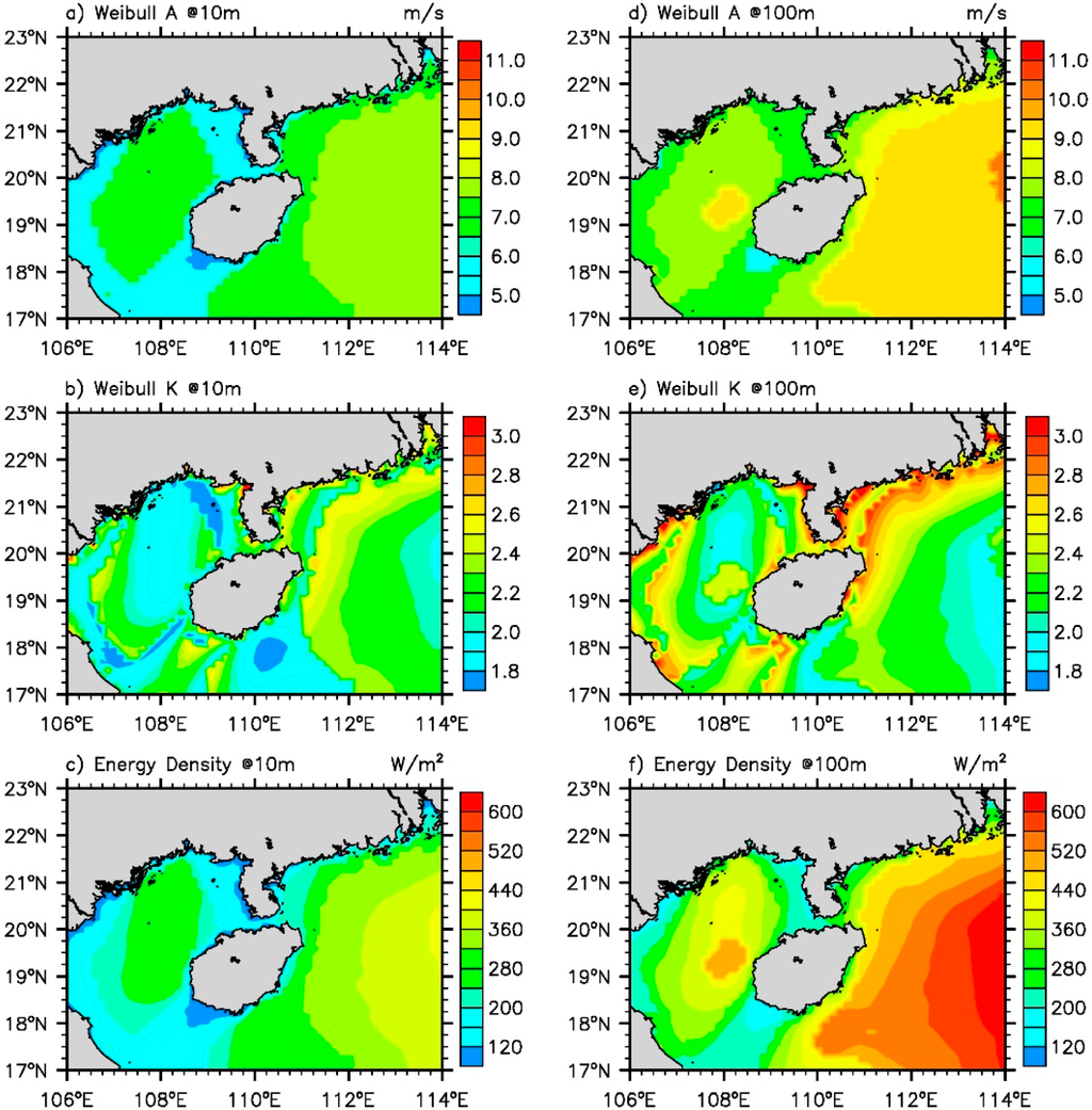 The wind energy resource statistics in the SCS are calculated based on the hourly reconstructed wind data using the method in Section 4. The resulting maps are presented in Figure 10, showing the Weibull A and k, and wind power density E, at 10 m and 100 m height. The spatial variability of the wind energy resources at these two heights is similar, but the absolute values are higher at 100 m than at 10 m. At 100 m height (Figure 10 (right)), Weibull A ranges from 7.5 m/s along the eastern Hainan coast to 9.5 m/s over the eastern part of the study area and from 7.5 m/s along the southwestern Hainan coast to 9.5 m/s over the western water area of this coast. Weibull k ranges from 1.9 over the open ocean, western and eastern parts of the study area, up to 2.5 near the coastlines. Wind power density values range from 400 to 600 W/m2. The higher wind power density values are found over the southwestern and eastern parts of the study area.