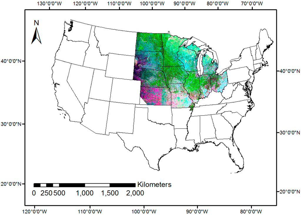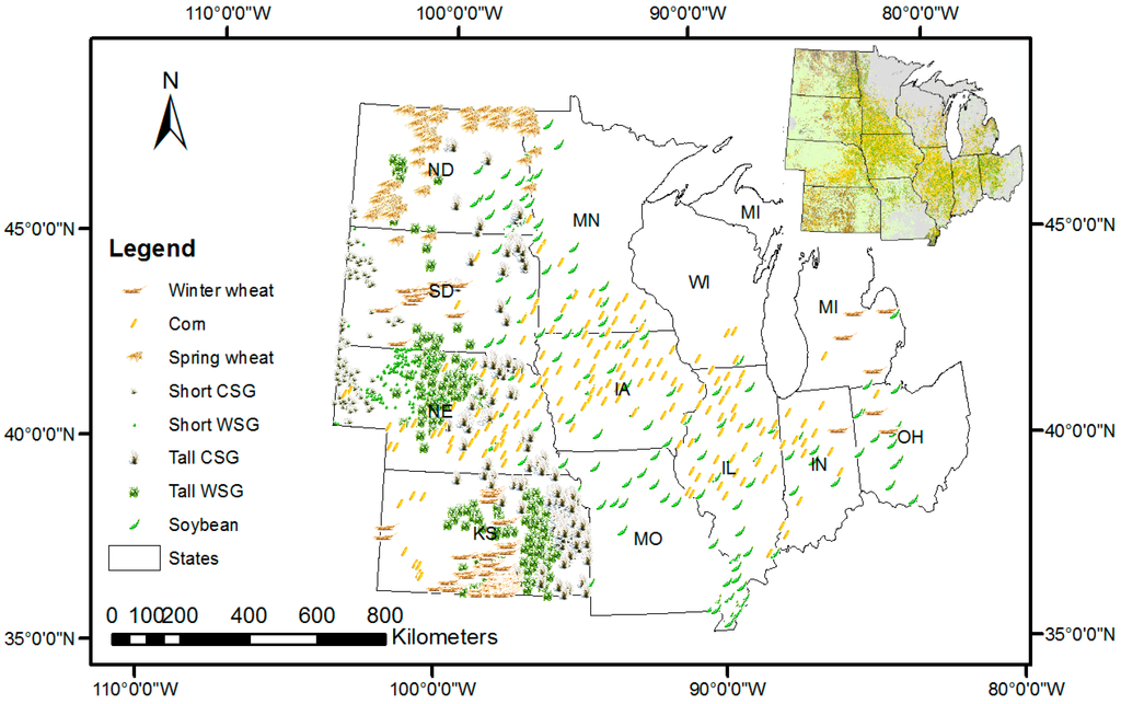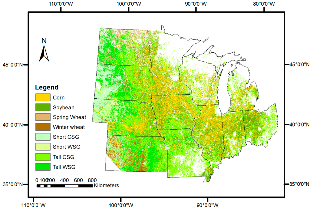 The Midwest is one of the major agricultural regions in the United States. In 2007, the Midwestern states had a market value of over $76 billion for crops (corn, soybean, wheat, and forage grass) and livestock [1]. Currently corn grain is still the most commonly utilized feedstock for ethanol [2]. With increased biofuel demand, food security and environmental contamination from intensified corn cropping become major concerns in this region [3]. Perennial native prairie grasses are recognized as promising alternative energy crops for cellulosic feedstock [4]. The USDA National Agricultural Statistics Service (NASS) publishes annual cropland data layer (CDL) products, in which annual crops are classified from satellite images at 30–56 m resolutions [5]. Perennial crops, however, are not examined in these products. To assist with sustainable bioenergy land use, there is a need for accurate mapping of energy crops in this important agricultural region.