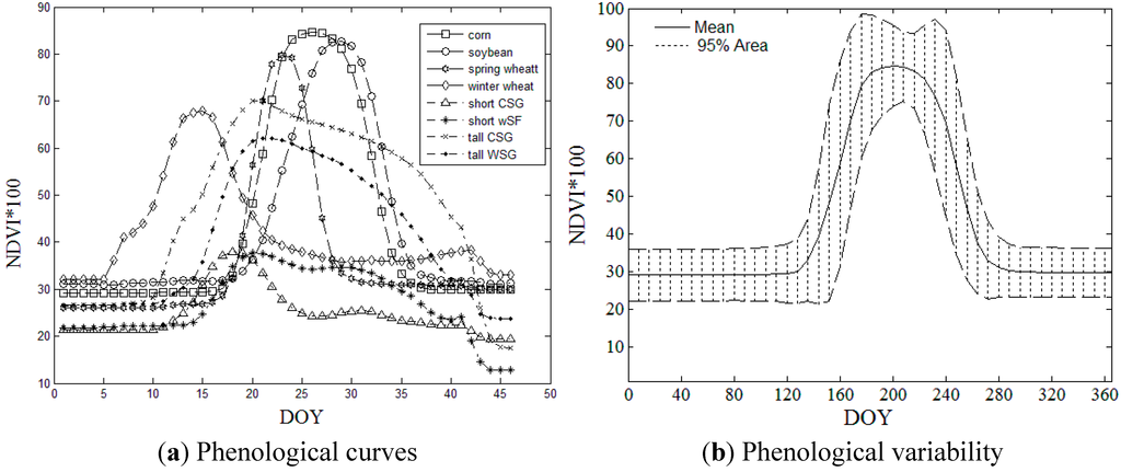 The smoothed NDVI time series of the eight crops (a) and phenological variability using corn as an example (b). The X-axis represents the Day-of-Year (DOY) of data acquisition dates in 2007.