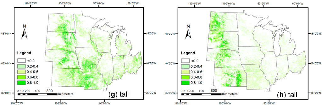 Shortgrass in the west of the region extended from the shortgrass prairie in the Great Plains. Cool-season shortgrass (Figure 5e) dominated in the Black Hills along the west edge of South Dakota, adapting to the cold, upland climates. Warm-season shortgrass (Figure 5f) mainly grew in the Sand Hills, Nebraska, a typical mixed-grass prairie and the largest unplowed prairie remnant in the United States. Cool-season tallgrass (Figure 5g) distributes all over the Midwest because it has been commonly planted as a productive forage species in pasturelands across the region. Their percent covers varied, in mixed conditions with grasses in western states and annual crop fields (especially corn and soybeans) in eastern states. Warm-season tallgrass (Figure 5g) was native to the tallgrass prairie in the central United States. Today it is mostly observed in prairie remnants in the south (e.g., the Flint Hills in KS and the Sand Hills in NE) and upland mixed-grass grazing prairies in the north. Compared with binary classifications, the percent cover maps in Figure 5 present more quantitative information about crop distribution, and improve the level of detail in coarse-resolution images.