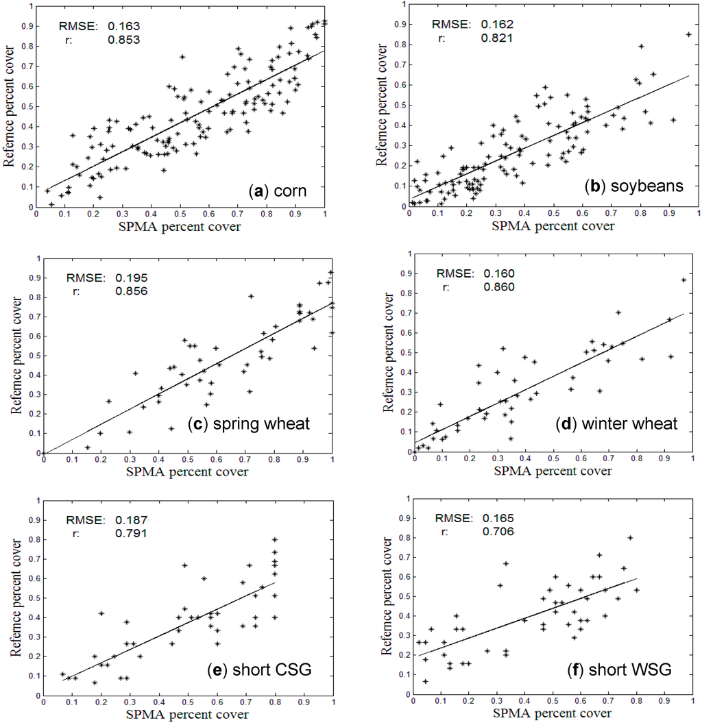 The scatterplots between the SPMA-extracted percent covers (X-axis) and references (Y-axis) for the eight crops: corn (a), soybean (b), spring wheat (c), winter wheat (d), cool-season shortgrass (e), warm-season shortgrass (f), cool-season tallgrass (g), and warm-season tallgrass (h).