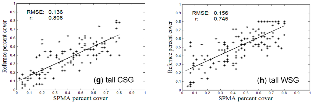 When percent covers at all validation samples were considered (Figure 6), the Pearson’s correlation coefficients (r) in the scatterplots ranged from 0.706 to 0.860 for these crops, suggesting fair agreement between the SPMA-extracted and CDL-summarized percent covers. The relationships were statistically significant (p < 0.001) under the Student’s t test (degree of freedom = 149 for corn, soybeans, and tall grasses, and 49 for other crops). Table 2 also lists the Student’s t values of the test for all crops. Although all tests were significant, perennial crops had smaller t values than annual crops, which may be attributed to the uncertainties when their samples were extracted from the coarse-resolution grass abundance maps [15]. For annual crops (Figure 6(a–d)), the SPMA could effectively extract their percent covers in the lower end. In the higher end, however, the SPMA results turned out to be overestimated, because other crops (e.g., alfalfa, sorghum) and small plots of non-crop land covers were not considered in this study. For this reason, the correlation line was lower than the diagonal line in each plot. For perennial crops (Figure 6(e–h)), the references were from the ranked grass cover maps extracted from the MODIS time series. The points were more scattered in their scatterplots, but the RMSE reached similar values to those of annual crops.