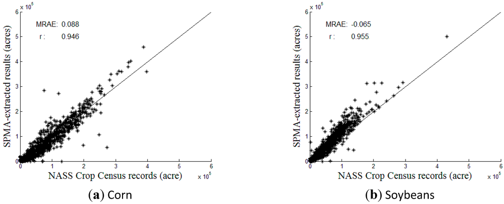 As the primary crops in the Midwest, corn and soybeans maintained good records of planting areas from the county-level NASS Crop Census data in 2007. To be comparable with these records, the pixel-level SPMA results were summarized into county-level crop planting acreages. The census records in a total of 1046 counties were extracted in the Midwest. Only corn and soybeans were compared. Other crops were not examined because spring wheat and winter wheat only grew in limited counties in the region. The warm-season and cool-season grasses were not specifically recorded in the census data.