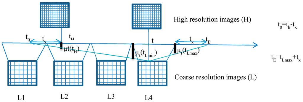 Figure 1 shows a schema of this idea, which includes the graphic representation of the validity degrees (μ). We have two time series: one of high-resolution images (H) taken at dates tH and one of low/coarse-resolution images (L), which are composite images of several days within a temporal range [tLmin, tLmax] (tLmin and tLmax represent the first and last days of the compositing image). The unimodal function of the temporal distances between the input images H and L is a triangular membership function of a fuzzy set defined on the temporal domain of the time series; the central vertex is t and the other two vertices t0 and tE are placed before and after t. Therefore, the validity of a timestamp tH is computed as follows:
