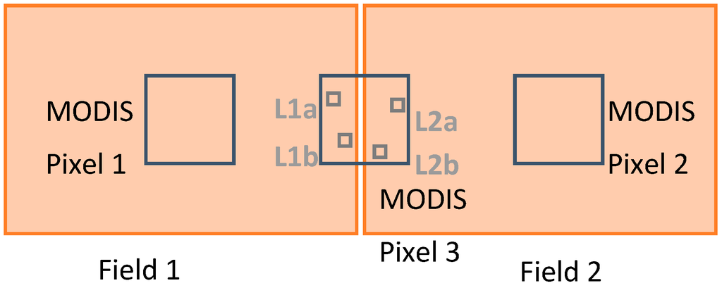 The time series from 2009 and 2010 were used (MODIS time series and enriched Landsat time series). The evaluation procedure (Figure 4) consisted of identifying two neighboring fields from the H images, where one pure L pixel could be identified in each field (pixels 1 and 2 in Figure 4). The temporal profile of the pure-resolution pixels was extracted from the MODIS time series. A mixed L pixel was identified in the limit between both fields (pixel 3 in Figure 4). Inside the mixed pixel, some H pixels (grey polygons) were identified as belonging to field 1 (L1a, L1b) and the others as belonging to field 2 (L2a, L2b). The temporal profile of the H pixels was extracted from the enriched Landsat time series. Temporal profile of pixels L1a and L1b should be close to temporal profile of MODIS pixel 1 because they belong to the same field. Similarly, pixels L2a and L2b should have a close temporal profile to MODIS pixel 2. Moreover, if the fields are different, the profiles of pixels belonging to field 1 (L1a and L1b) should be different from those of field 2 (L2a, L2b). If the temporal profiles of the fused images behave like that, this would prove a good performance of the fused images for monitoring purposes.