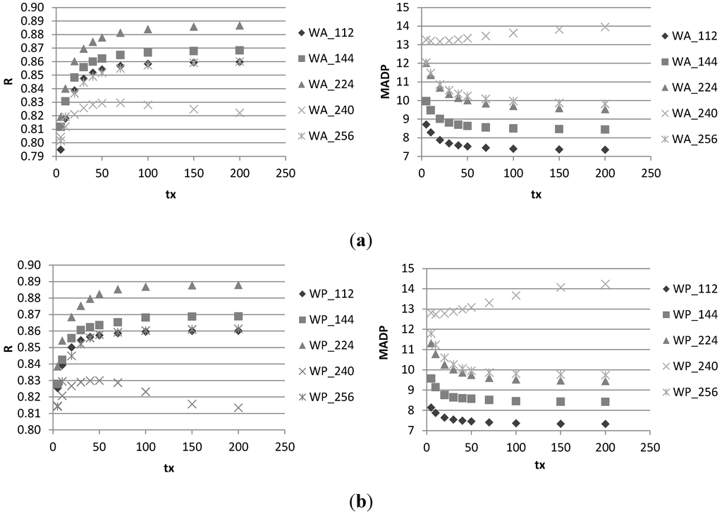 In this second experiment, the methods WA and WP with p = 2 were used to analyze the effect of tx. For each target date, the best combination of input images was selected from the results in Table 1. tx was varied between 5 and 200. The results of the correlation and the MADP are shown in Figure 6. Augmenting the temporal range [t0, tE] leads to closer validities of the H and L images. When the H image is not too far, we expect to obtain better accuracies when augmenting this range. In Figure 6, we observe that the correlation generally increases at the beginning and stabilizes after a certain value, which is consistent with the previous hypothesis. In contrast, in the case of the MADP, it decreases before stabilizing. However, there is a case where the performance is slightly different, and instead of stabilizing, the correlation begins to decrease, and the MADP begins to increase. This is case of the target date 240, where the input H and the target are far away in time (there is a difference of 96 days). A higher range usually provides closer validities between the H and L; however, when the H is far, we should give lower validity to this image; otherwise, the fusion method leads to slightly lower accuracies.