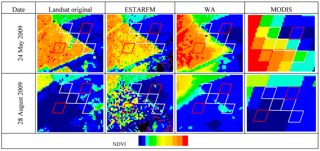 The comparison between ESTARFM and WA lead to similar results, lower errors were generally obtained with WA, but visual inspection showed that in ESTARFM structures seemed better defined; however there were important local errors using ESTARFM, probably due to the need of two high resolution images as input, this force to use images that are far away in time. Because WA was applied to fuse NDVI images and ESTARFM to fuse red and NIR bands, some tentative experiments have been carried out to compare the WA method with ESTARFM method where both are directly applied to the spectral bands as input pixel values. A validation on the 5 Landsat images of 2009 (see Table 3) lead to similar results to those presented previously by applying the proposed fusion to the NDVI images, thus providing promising results which deserve confirmation by consistent and thorough experiments.