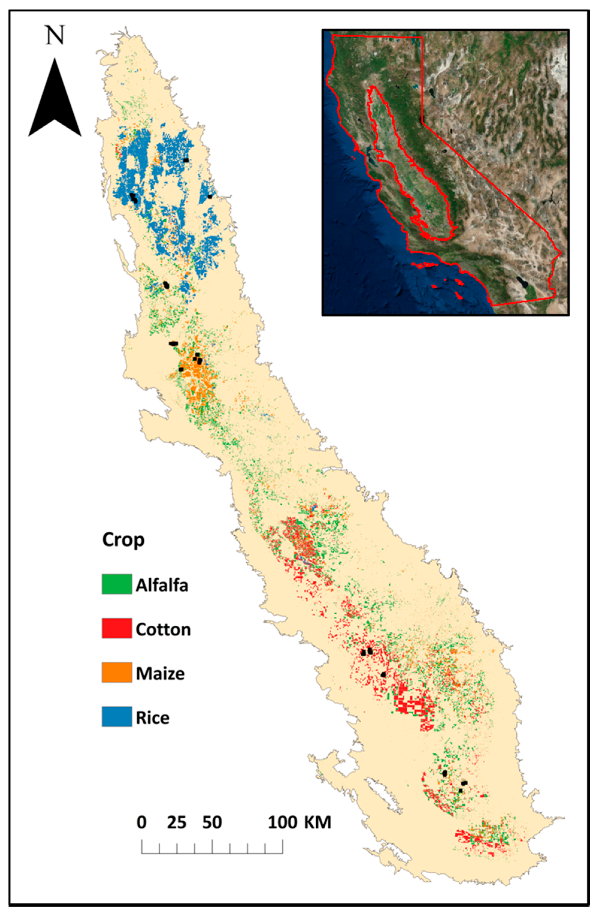 This work was funded primarily by the United States Geological Survey (USGS) Climate and Land Use Mission area’s Geographic Analysis and Monitoring and Land Remote Sensing programs in concert with the Mendenhall Research Fellowship Program. Undergraduate and graduate student field support was granted through a cooperative initiative between the USGS and The National Association of Geoscience Teachers. We would like to our extend special thanks to Tony Chang, Jeff Peters, and Bobbijean Freeman who collected the field data and the agricultural extentionists (Mark Keeley, Chris Greer, Cayle Little, Bob Hutmacher, and Shannon Mueller) from the University of California at Davis (UCD) who put us in contact with growers or farm managers interested in our work and permitted us to collect data on UCD managed research farms (West Side and Shafter Research and Extension Centers). We would also like to thank the growers and farm managers (Chuck Mathews, Don Bransford, Jim Casey, Blake Harlan, Mark Boyd, Steve Mellow, Danny Kirshe nmann, John Diener, Marty Roads, Joel Ackerknecht, Scott Schmidt, and Kurt Boeger). Lastly, we would like to thank Deborah Soltesz, Miguel Velasco, Larry Gaffney, and Lois Hales who administered day-to-day logistics while we were in the field.