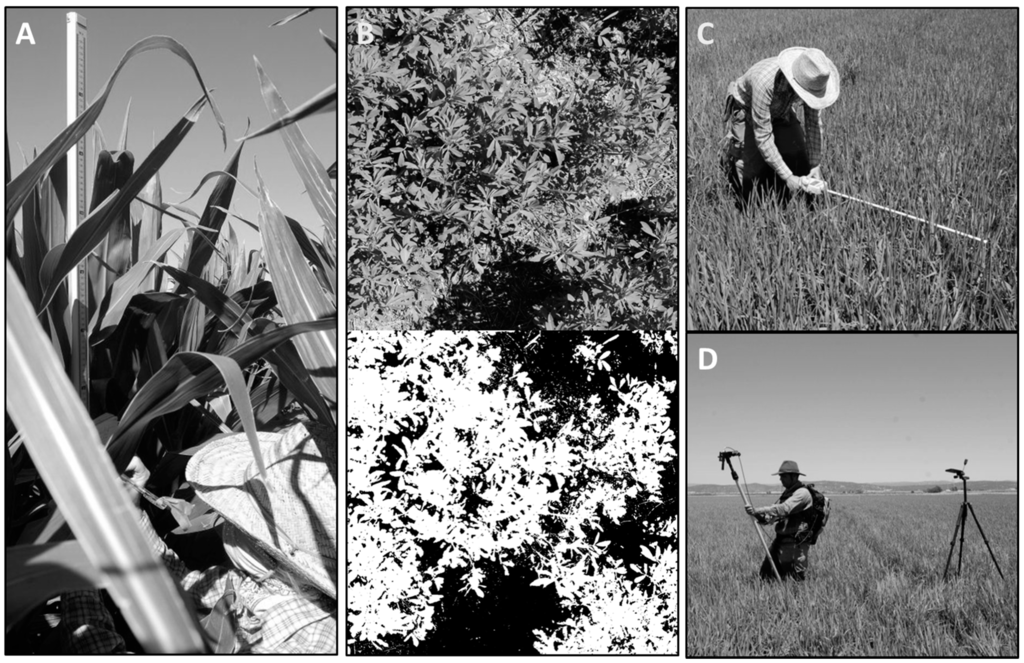 Crop height was measured with a measuring tape for short canopies (alfalfa, cotton, and rice) and a telescoping measuring rod for maize (Figure 2A).