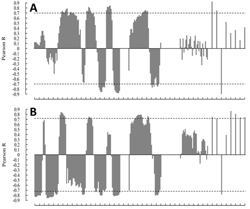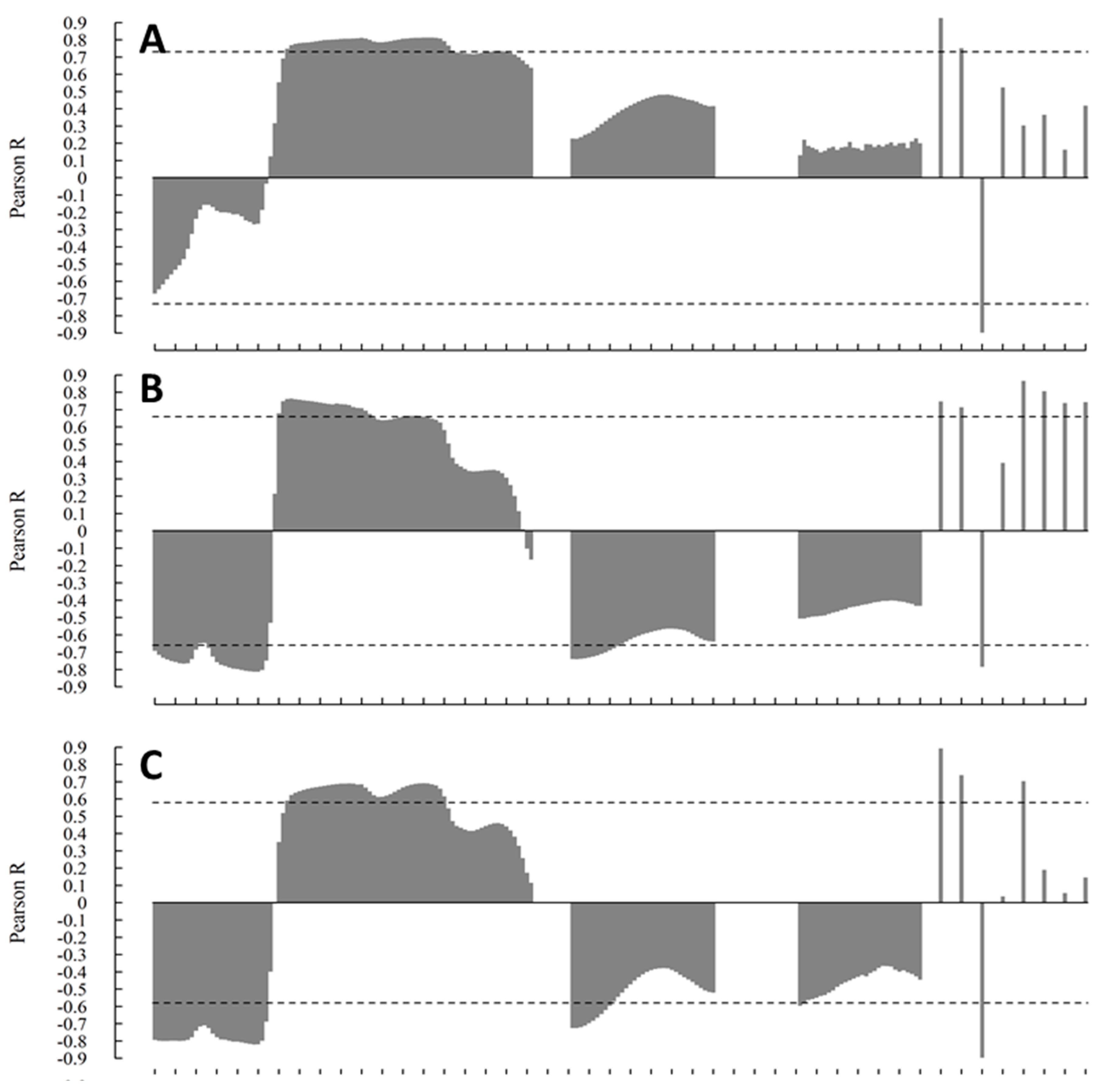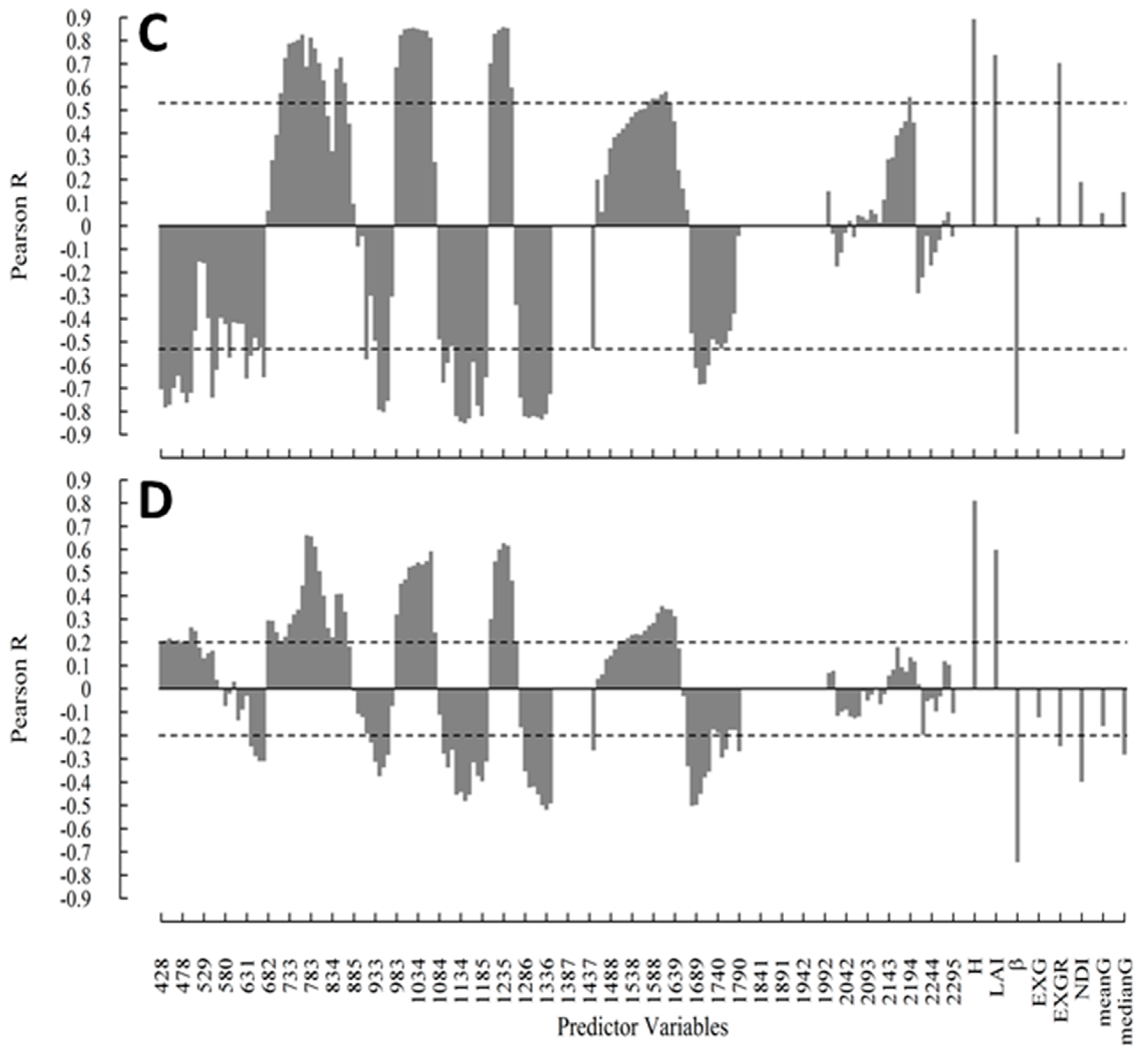 The stepwise regression approach discussed in Section 2.4.1 requires that the number of predictors (p) is less than the number of samples (N), so a selection process was used a priori to remove predictors with relatively limited explanatory power. Other data reduction techniques were tried such as Principal Components Analysis (PCA), but yielded poorer results during validation (not shown). In addition, [53] found that PCA regression which uses the components of PCA for predictive purposes performed more poorly than other empirical methods using the same spectral data. In our procedure, a cutoff threshold was determined based on the highest ranked predictors: p values were ranked from highest to lowest based on their correlation with AWB and only the N – 1 highest ranked p was selected for further analysis.