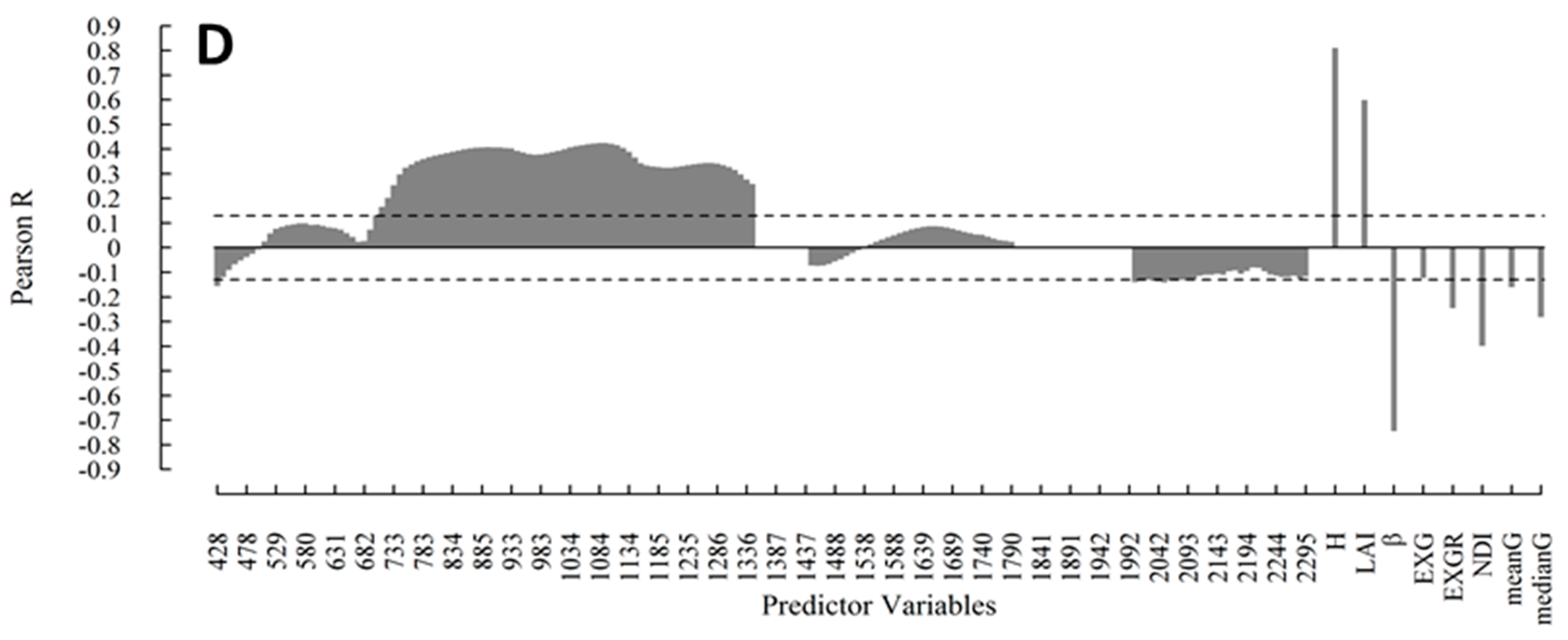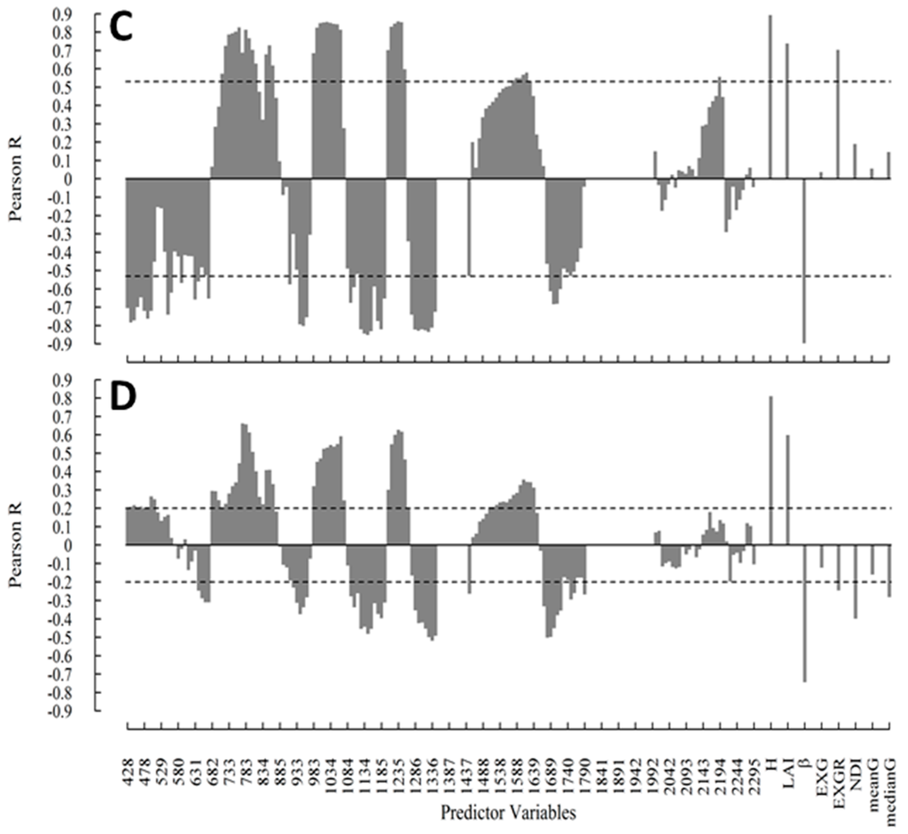 The reduced list of untransformed or transformed HNBs and non-spectral (H, β, EXG, EXGR, NDI, meanG, and medianG) predictors were evaluated using stepwise regression to identify the optimal MBVI for each crop:
