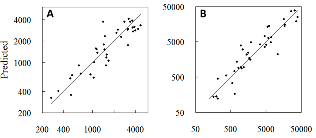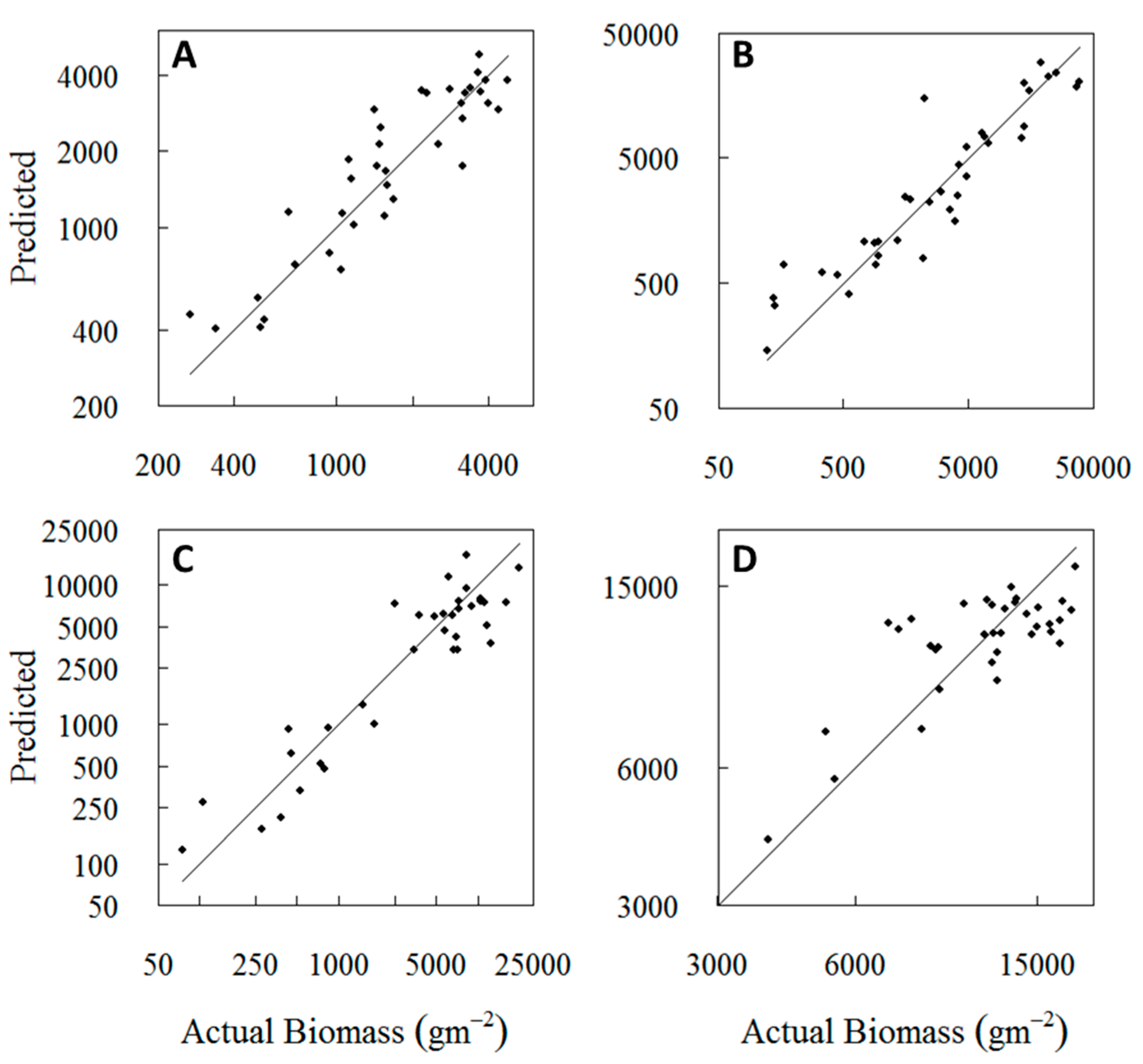 Scatterplots of observed (validation subset) versus predicted aboveground wet biomass using the multiple-band vegetation indices shaded in gray from Table 2 for rice (A); alfalfa (B); cotton (C); and maize (D). The diagonal line represents a 1:1 relationship. With the exception of alfalfa, which is built on 1st order derivative transformed spectra, equations are built on the untransformed spectra.