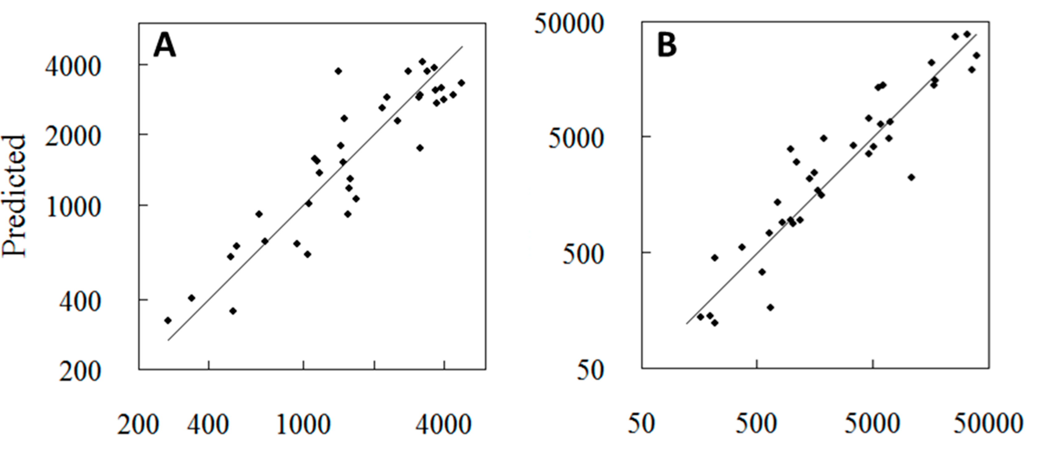 Seventy percent of the data were selected at random and stratified by crop type to build the models, while the remaining 30% of the data were held back for validation. The biomass data were inherently non-linear, so they were log (base 2) transformed to facilitate linear model-building. The models were developed for each crop, as an “all crops” model showed significantly lower correlations with AWB. The linear models were developed using the “regsubsets” function in the “leaps” package. The regsubsets function performs a stepwise search for the linear model that minimizes the Bayesian Information Criterion (BIC). The BIC, as with the Akaike Information Criterion, penalizes over-fitting when new predictors are introduced [58]. The regsubset function identifies the optimal (minimum BIC) model using one or more predictors. The results are displayed in a convenient tabular format up to j, which is defined a priori. The maximum number of predictors was set using the ratio of the number of bands (M) to the number of samples (N) or M/N criterion [32]. When the M/N ratio exceeds a threshold of 0.15, over-fitting is likely to occur. The sample size for the calibration subset was 71, 103, 100, and 53 for alfalfa, cotton, maize, and rice, respectively. If a sample had any missing predictor values, it was omitted to maintain consistency across samples. Based on the M/N criterion, j = 9, 11, 11, and 6 for alfalfa, cotton, maize, and rice were used in the regsubsets function, respectively.