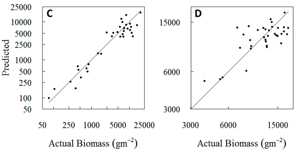 Scatterplots of observed (validation subset) versus predicted aboveground wet biomass using the two-band vegetation indices shaded in gray from Table 3 for rice (A); alfalfa (B); cotton (C); and maize (D). The diagonal line represents a 1:1 relationship. With the exception of alfalfa, which is built on 1st order derivative transformed spectra, equations are built on untransformed spectra.